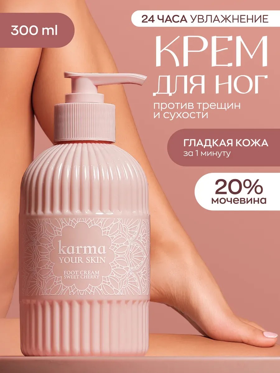 Крем для ног KARMA your skin - это косметическое средство, которое подарит вашим ножкам и пяточкам невероятное увлажнение, питание и мягкость. Увлажняющий крем от трещин и сухости направлен также на борьбу с обветренной кожей, натоптышами и сухими мозолями. Подходит для ежедневного применения утром, днем или вечером. Специально разработанная формула крема с маслами, витаминами и растительными экстрактами спобоствует восстановлению и тонизированию всех типов женской кожи: нормальной, сухой, жирной или комбинированной. Масло ши повышает упругость и эластичность кожи. Оливковое масло в составе способствует заживлению трещин на локтях и пятках, устранению сухости и шелушения. За глубокое питание и увлажнение, а также быструю регенерацию клеток эпидермиса отвечает пантенол. Стеариновая кислота защищает от агрессивного воздействия факторов окружающей среды. Ментол тонизирует и обладет небольшим антибактериальным эффектом, что значительно снижает потливость и появление неприятного запаха. Зимний крем с мочевиной обладает сладким вишневым ароматом по мотивам знаменитого Lost Cherry. Уход за ножками превратится в сеанс ароматерапии у вас дома, устроив своим ногам массажный сеанс. Активно смягчает кутикулу, придавая ухоженный вид пальчикам.