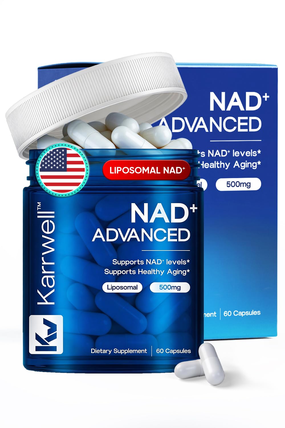 30-Day Supply of Clean, Effective Ingredients: Each bottle contains 60 easy-to-swallow capsules, providing a 30-day supply with a safe 500mg dose of liposomal NAD and no fillers, gluten-free, vegan, and non-GMO for clean, high-quality support. NMN Supplement Alternative: Karrwell NAD Advanced offers a more effective alternative to NMN supplements, providing an easier, more efficient way to support NAD levels, mental clarity, and endurance throughout the day. . Boosts Longevity with Trans-Resveratrol: Includes Trans-Resveratrol, a powerful antioxidant known for its anti-aging benefits and ability to activate longevity pathways, working synergistically with NAD supplements for Women Men to support healthy aging and metabolic health. . Supports Cellular Energy Mitochondrial Health: NAD plays a key role in supporting mitochondrial function and cellular energy production, helping to fuel your body's daily energy needs and optimize overall vitality. . Advanced Liposomal NAD for Maximum Absorption : Each serving of Karrwell NAD Advanced delivers 500mg of liposomal NAD , utilizing liposomal technology for superior absorption and bioavailability, ensuring your body gets the most out of every capsule.