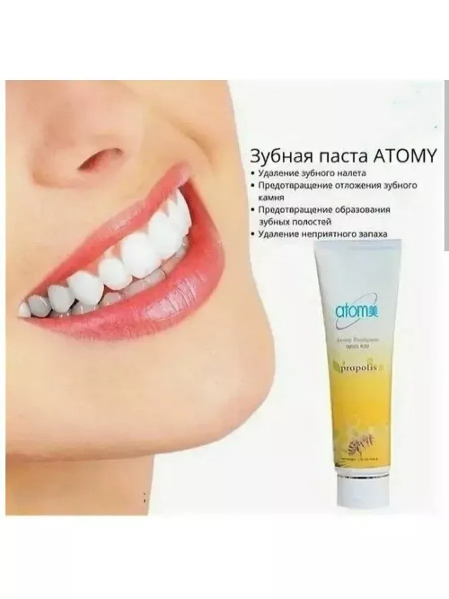 Многофункциональная зубная паста (Атоми), разработанная в Корее - премиального качества, для всей семьи, в выгодной упаковке 200 грамм (в два раза больше, чем все обычные пасты). Зубная паста совмещает ежедневный уход и профилактику, с мягким отбеливанием на 1-2 тона в месяц и надежную защиту от кариеса. Активные элементы в составе пасты обеспечивают защиту зубов и десен, предотвращают отложение зубного камня, быстро и эффективно уничтожают налет и бактерии, которые являются источником неприятного запаха. Основными ингредиентами в составе пасты являются: экстракт прополиса (природный антисептик, антибиотик с антибактериальным и противовоспалительным эффектом для предотвращения распространения различных бактерий и вирусов) и экстракт ЗЕЛЕНОГО ЧАЯ (катехины в его составе, усиливают иммунитет, обладают эффектом антиоксидантов и антибиотиков, благодаря дезодорирующему действию эффективно удаляет неприятный запах). Входящий в состав диоксид кремния (Hydrated Silica) абразив, который не вредит эмали, но при этом эффективно очищает и полирует ее (на сегодня такие пасты считаются более бережными, эту основу используют в производстве детских паст).Средство в удобной (вертикально стоящей) тубе, подходит для ежедневной чистки взрослых и чувствительных детских зубов. Пасту могут использовать взрослые, дети (девочки и мальчики) с двух лет, парни и девушки - подростки. Это универсальная женская и мужская чистящая зубная паста с безопасным органическим составом. Зубная паста с прополисом не содержит фтора, отличается высоким пенообразованием, сохраняет свежесть на протяжении длительного времени, имеет приятный, мягкий вкус. Большой, семейный тюбик пасты удобного объема и формата, можно брать с собой в путешествия или командировку. Паста подходит как средство для ухода за зубами при ношении брекетов. Безопасный состав идеален для ежедневной гигиены полости рта, подходит беременным и кормящим женщинам.