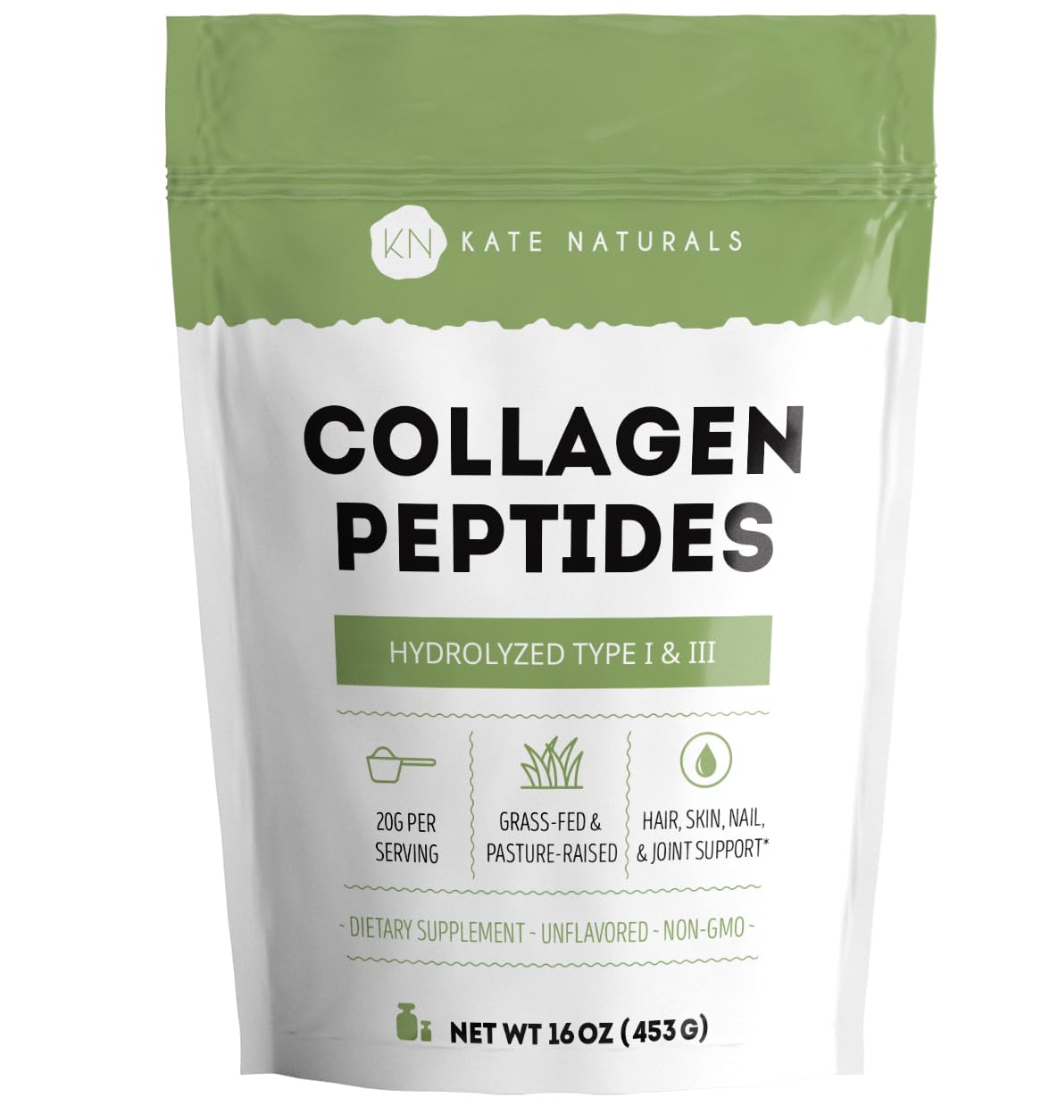 OUR PROMISE: We aim to provide high quality products. If this doesn't work out for you, please let us know so we can make it right. NATURAL INGREDIENTS: Our grass-fed collagen peptides is non-GMO, gluten-free, and soy free to support a balanced lifestyle. UNFLAVORED AND EASY TO USE: This unflavored collagen powder dissolves into liquids with no clumping. It's easy to mix into your coffee, tea, smoothies or your favorite foods or drinks without altering the flavor or texture. HAIR, SKIN, NAIL, AND JOINT SUPPORT : Our collagen peptides supplement supports hair, skin, nail, and joint wellness. 20G OF COLLAGEN PER SERVING: Kate Naturals' Collagen Peptides delivers 20 grams of hydrolyzed collagen peptides in every serving, providing Types I and III bovine collagen.