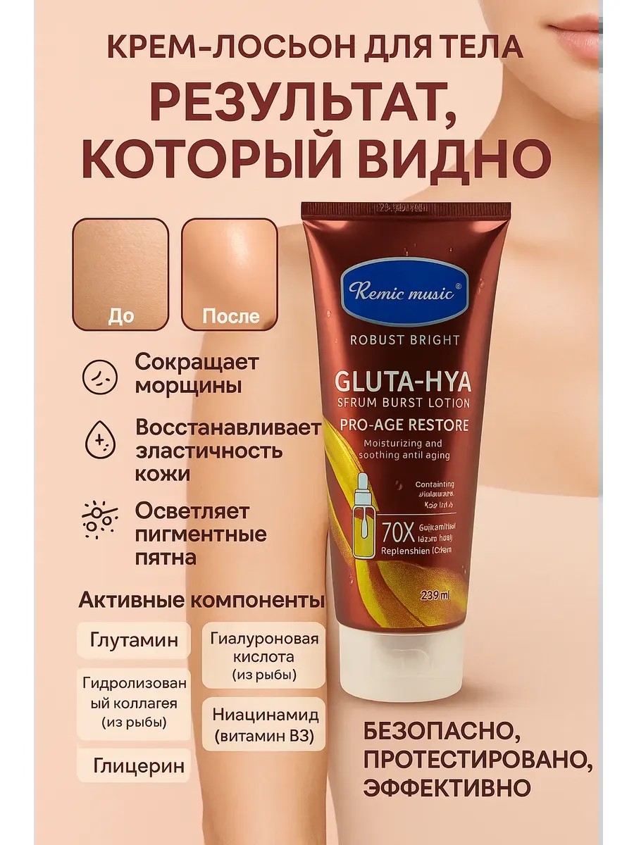 Ощутите, как ваша кожа преображается день за днем. Remix Music GLUTA-HYA – это не просто увлажняющий крем для тела, это высокоэффективное антивозрастное средство, созданное для восстановления, питания и омоложения кожи. Благодаря мощной формуле с 70-кратной концентрацией глутамина и коллагена, этот лосьон-сыворотка действует сразу после нанесения, глубоко проникая в кожу и запуская процессы регенерации.