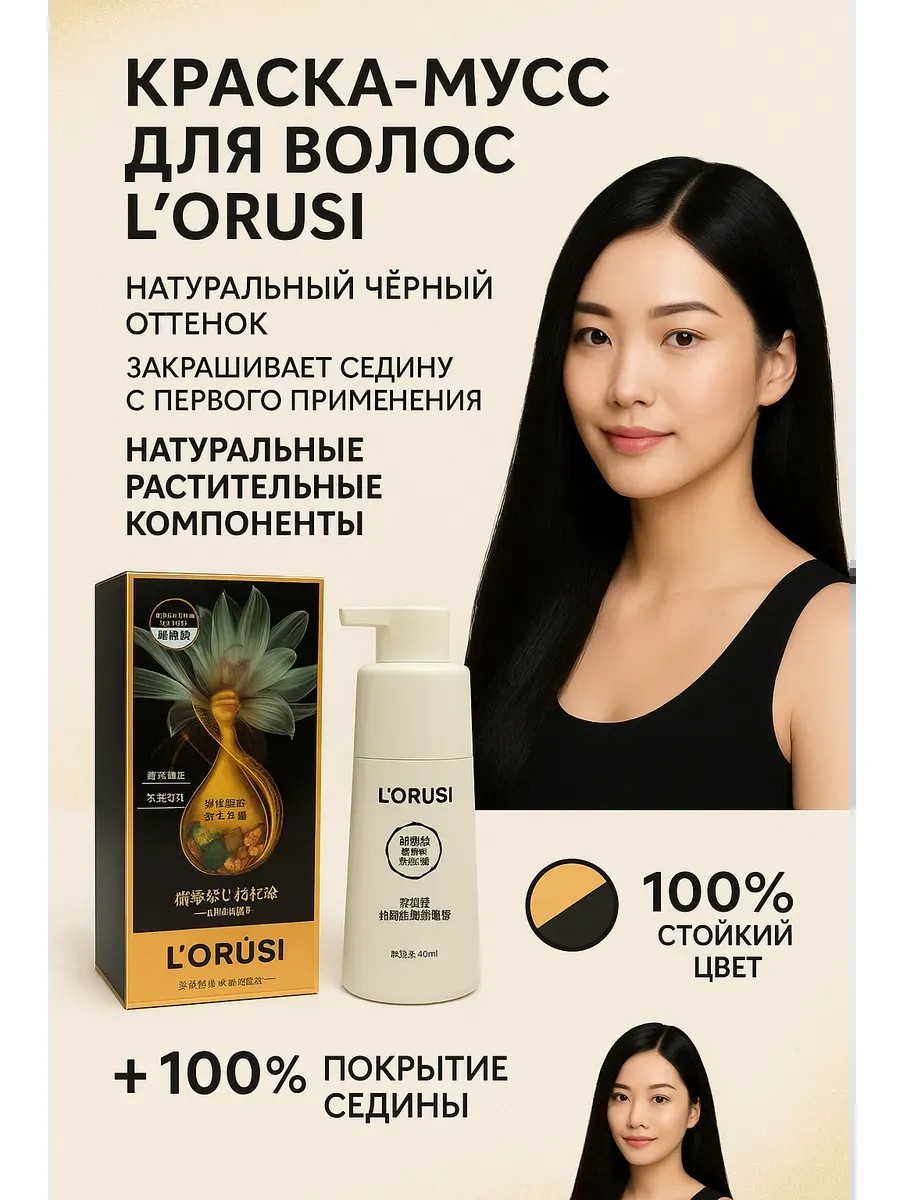 L'ORUSI hair color mousse is an innovative product for long-lasting and gentle coloring, created for those who value quality, ease of use, and a natural result. The mousse format allows for easy and even distribution along the entire length of the hair, avoiding streaks and uneven coloring. This gray coverage spray is suitable for home use and provides professional results without the need to visit a beauty salon.