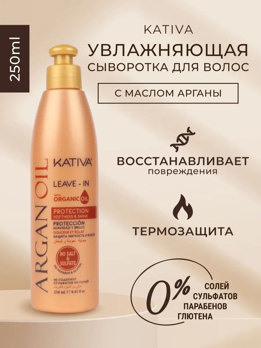 When hair lacks moisture and is damaged by heat styling, frequent coloring, or bleaching, it begins to break, thin, and become dull. This type of hair requires restorative care and reliable protection. Argan oil—a storehouse of vitamins, fatty acids, and antioxidants—is ideal for restoring strength, hydration, and shine to dull strands. Containing pure organic argan oil, Kativa's Argana Hair End Serum revives dull strands, filling them with energy and healthy shine. This rich, leave-in hair serum with a creamy texture contains 91% natural ingredients and is suitable for all types of damaged hair: straight, curly, natural, color-treated, and bleached. This hair serum is ideal for styling, does not weigh hair down, provides heat protection, and smoothness when blow-drying or straightening. This leave-in hair serum is recommended for: Damaged and weakened hair that has been exposed to chemical or mechanical treatments. For dry and brittle hair, including damaged ends and damaged hair along its entire length. For hair that has lost its shine and strength, as well as coarse, unruly hair. Thanks to fruit acids, this restorative hair serum adds extra shine. This professional hair serum is designed for regular care and protection; its positive effects are noticeable after just one use. With regular use, hair becomes stronger and more resilient, ends are restored, and breakage is reduced. For maximum hydration and restoration, this hair concentrate is used as a leave-in treatment in combination with the sulfate-free shampoo, conditioner, and Argana mask. Moisturizing serum. Professional hair serum.