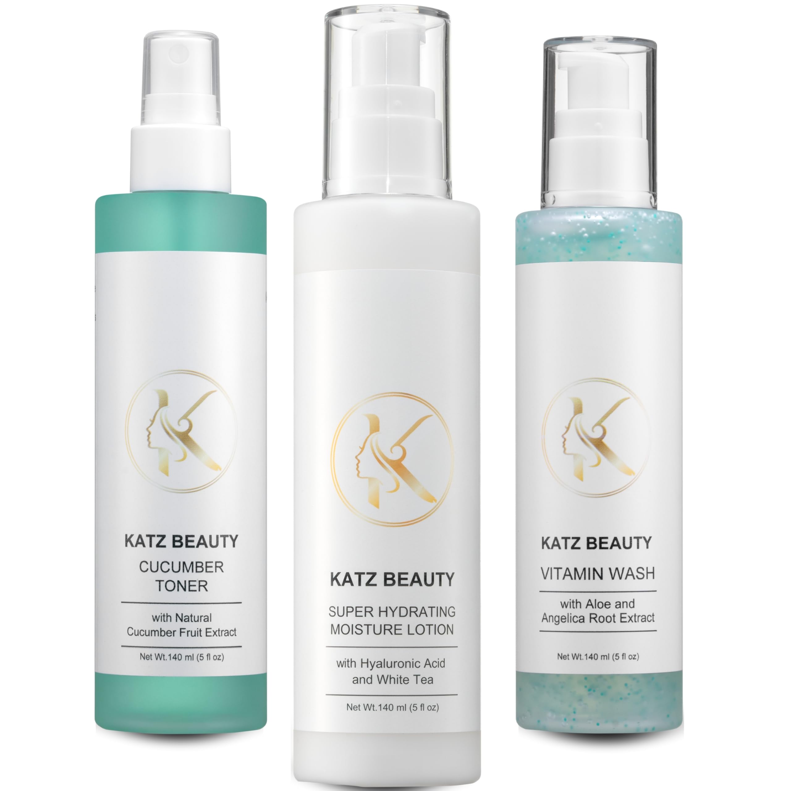 Streamline your morning with the Katz Beauty Quick Morning Glow Trio, designed for busy women who want radiant skin in minutes. This bundle includes the Vitamin Wash (5 fl oz), Cucumber Toner (5 fl oz), and Super Hydrating Moisture Lotion (5 fl oz). Infused with aloe, angelica root, cucumber extract, hyaluronic acid, and white tea, these products cleanse, tone, and moisturize efficiently. Perfect for all skin types, this trio delivers hydration and a fresh glow, prepping your skin for the day ahead. Simplify your routine without compromising results with Katz Beauty's gentle, effective formulas.Versatile for All Skin Types: Designed for busy lifestyles, this trio suits dry, oily, combination, or sensitive skin. The gentle ingredients—aloe, cucumber, and white tea—deliver hydration and soothing benefits without overwhelming the skin. Lightweight textures ensure quick absorption, ideal for mornings when time is tight. Pair with sunscreen for daytime protection and store in a cool, dry place to maintain efficacy, keeping your skin glowing and healthy every day. Time-Saving Routine for Busy Women: This trio is crafted for efficiency, offering a complete cleanse-tone-moisturize routine in under five minutes. The Vitamin Wash cleanses gently, the Cucumber Toner preps instantly, and the Super Hydrating Lotion seals in moisture fast. Free from parabens and sulfates, these products provide effective care without irritation. Perfect for women on the go, this bundle ensures radiant skin with minimal effort, fitting seamlessly into a hectic schedule. Instant Moisture with Super Hydrating Lotion: The Katz Beauty Super Hydrating Moisture Lotion (5 fl oz) locks in moisture quickly with hyaluronic acid and white tea extract, perfect for a rushed morning routine. This lightweight, non-greasy lotion absorbs fast, hydrating and protecting skin with squalane and sodium PCA. Ideal for dry or sensitive skin, it strengthens the skin barrier and delivers a radiant glow. Apply a small amount and massage in for instant softness, ready for makeup or sunscr. Quick Hydration with Cucumber Toner: Katz Beauty Cucumber Toner (5 fl oz) is a fast-absorbing, alcohol-free toner that hydrates and balances skin with natural cucumber extract. Perfect for busy women, it minimizes pores and reduces redness in seconds,{Hz} Simply sweep it on with a cotton pad post-cleansing to prep skin for moisturizer. Its soothing, lightweight formula refreshes all skin types, especially oily or combination, ensuring a smooth canvas for the next step. Fast, Gentle Cleansing with Vitamin Wash: The Katz Beauty Vitamin Wash (5 fl oz) is a time-saver for busy mornings, gently cleansing with aloe and angelica root extract to remove overnight impurities. Its creamy, foaming formula hydrates while cleansing, leaving skin soft and balanced without dryness. Ideal for sensitive skin, it includes glycerin and tocopheryl acetate to nourish the skin barrier. Just lather, rinse, and go—your skin is prepped in under a minute for a fresh, clean start to your.