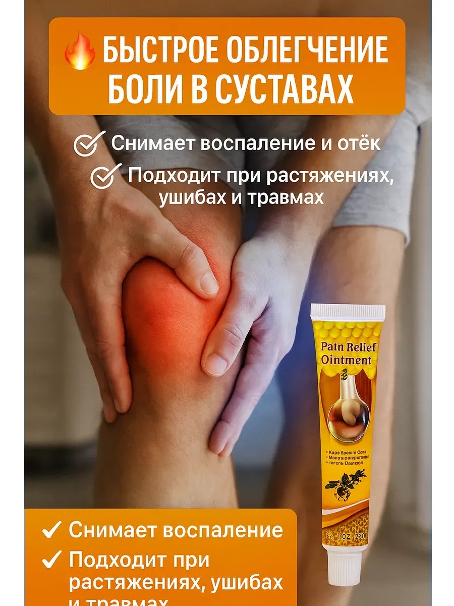 Pain Relief Ointment — эффективная мазь для суставов, мышц и связок. Подходит при болях в коленях, спине и суставах, а также после спортивных нагрузок, растяжений и ушибов. Благодаря натуральному составу (пчелиный яд, экстракты трав, имбирь, зелёный чай, франкинсенс) мазь быстро снимает воспаление, уменьшает отёчность и возвращает подвижность.