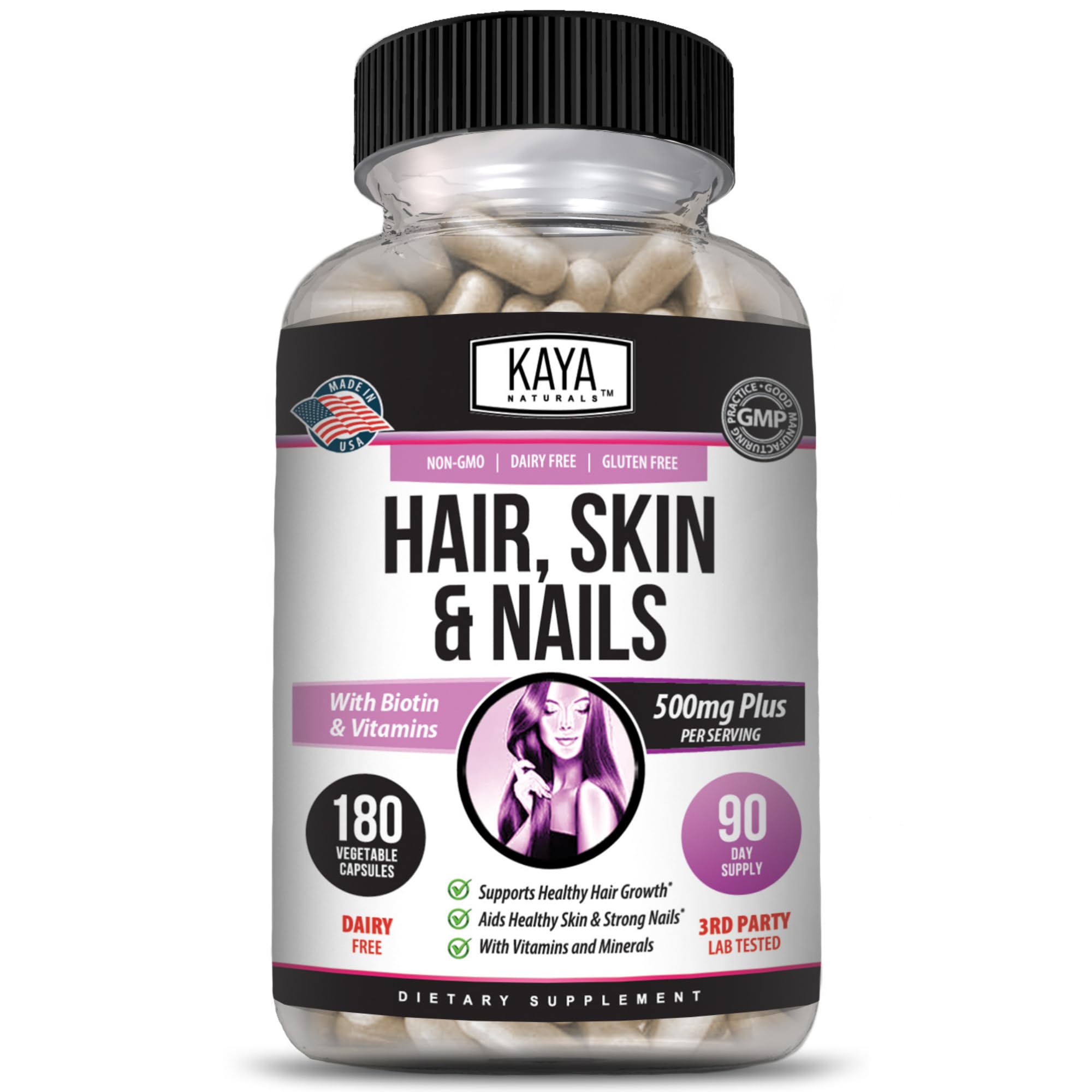 Kaya Naturals Hair Skin Nail Capsules BIOTIN Vitamin D Vitamin B-12 A Folic Acid Support Hair Support Vitamin Supplement - 180 Count 180 Count (Pack of 1)