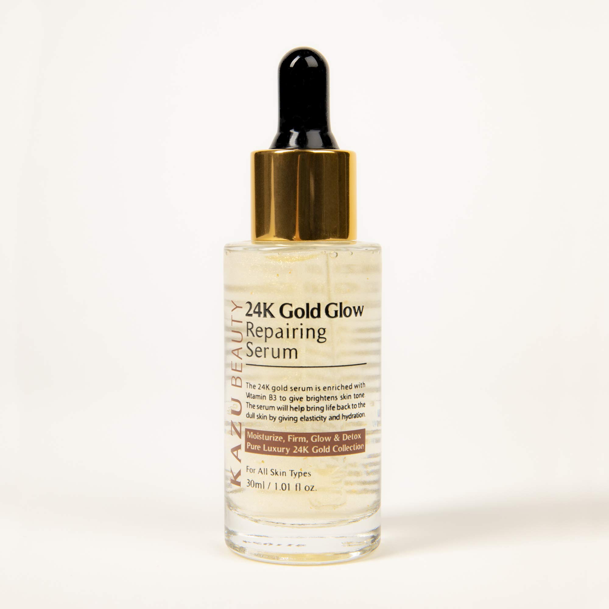 KAZU 24K Gold Glow Repairing Serum, its effect as a Moisturizer is proved to be the best, It also Firms, and give a great natural look 24K Gold Collection. The 24K gold serum is enriched with Vitamin B3 to give excellent skin tone. The serum will help bring life back to the dull skin by giving elasticity and hydration.