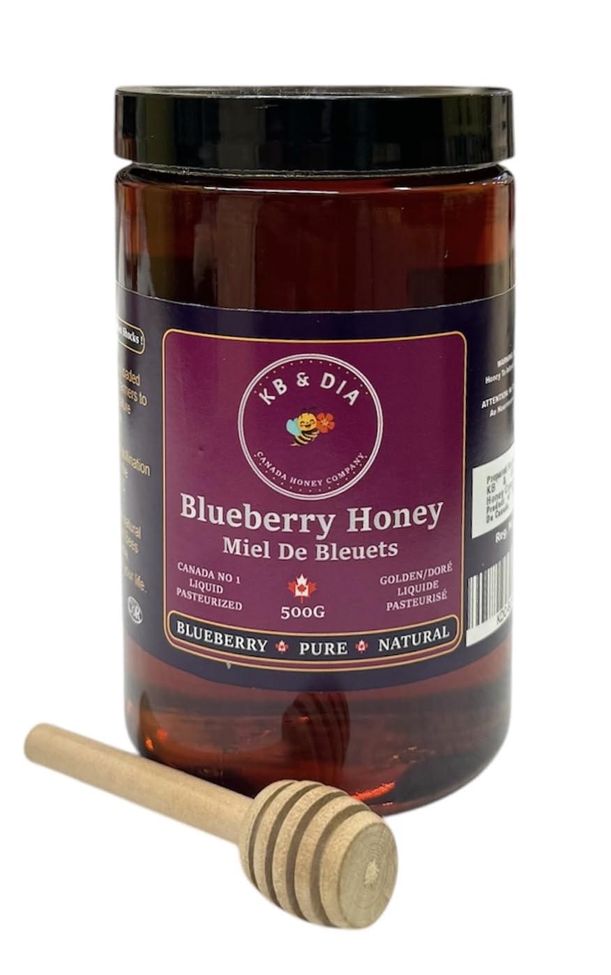 KB & Dia Pure Natural Canadian Blueberry Blossom Honey 100% Pure Canadian Blueberry Blossom Honey 100% Natural Canadian Blueberry Blossom Honey 500g Golden / Dore Liquid Pasteurized Pure Natural Canadian Blueberry Blossom Honey