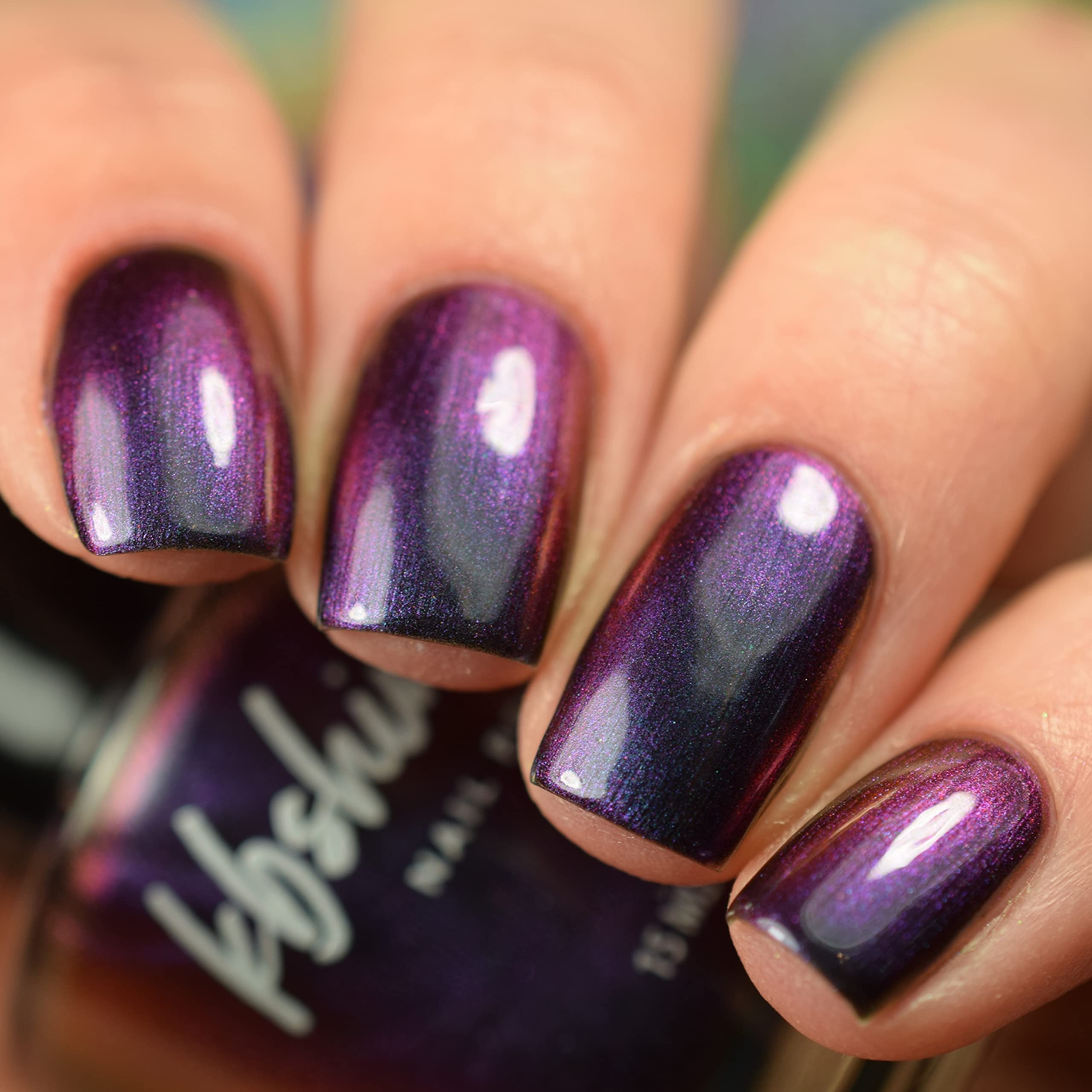 Late nights spent outside are magical. The sun gives way to the moon, showing off hues of deep red and purple as the sky turns from navy to black. Embers from a late-night bonfire offer an intimate glow, perfect for catching up with friends and family. Social media can compete with finding the Big Dipper or spotting a shooting star. But as the fire dies down and yawns replace laughs, the signs are there that it time for lights out. Lights Out is a nod to the calm sleep that comes after a day of adventure. A midnight-to-purple multichrome, Lights Out starts with a nearly black, not quite navy hue that quickly flips to a warm magenta. Ember hues give way to rich golds and a grape-like purple, for a unique, midnight-inspired nail polish. Lights Out is best in 2 coats. **All photos are from the same batch, but lighting, skin tones and cameras may affect the brightness and tone. See photos for notes on any layering.** Type: Multichrome Base: 5-Free Glitter Load: N/A Glitter Size: N/A Recommended Coats: 2-3 Coats Notes: This is not a quick-dry polish, we recommend following up with a coat of quick-dry top coat, like Clearly on Top. Additional Information This listing is for a standard full-sized 15ml /.5oz bottle with our glitter grabbing flat brush. Two stainless steel balls are included in every polish bottle. At KBShimmer we promise this polish is: 100% Cruelty-Free 100% Vegan 5+ Free and Does Not Contain a drop of: - Dibutyl Phthalate - Toluene - Formaldehyde - Formaldehyde Resin - Camphor - Xylene - Ethyl Tosylamide - Parabens