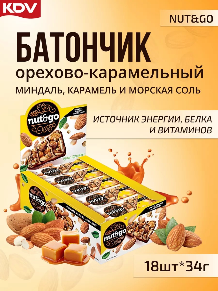 Батончик Nut and Go – идеальная композиция из цельного хрустящего миндаля, классической солёной карамели с добавлением морской соли для пикантности.