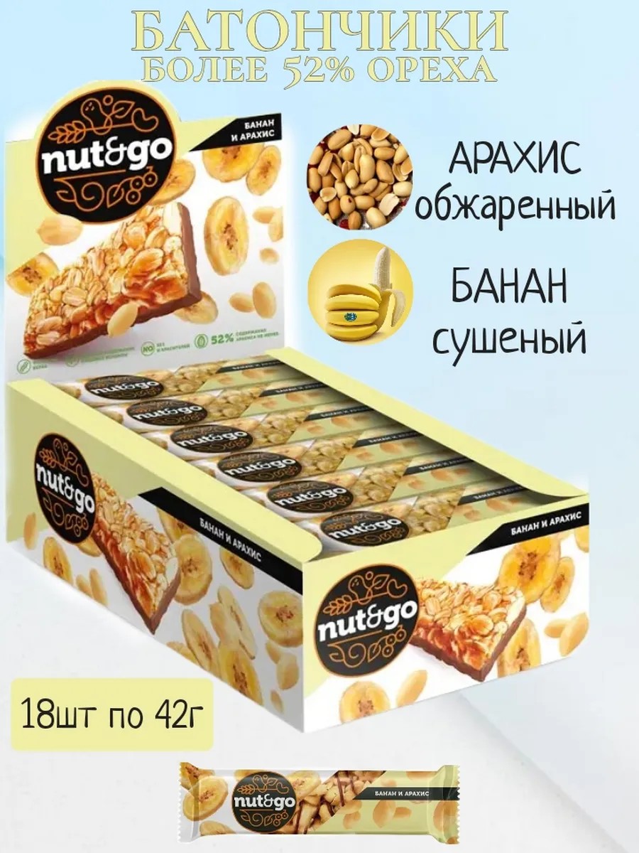 Батончики арахисовые с бананом Набор сладостей Nut and Go - вкусняшки с идеальным сочетанием из обжаренного арахиса, сушеного банана и небольшой порции молочного шоколада. В боксе целый набор батончиков - 18шт, а значит шоколадно-ореховых вкусняшек хватит на всех. Шоколадные конфеты с натуральным ореховым протеином. Благодаря щедрой порции арахиса (в составе батончика Nut Go орехов более 52%), это лакомство не просто еда, а отличный источник энергии, белков, витаминов и аминокислот - это естественные натуральные протеиновые батончики на основе орехов. Любителям протеиновых и злаковых батончиков стоит к ним присмотреться как к источнику энергии и полезных для организма веществ. Nut and Go арахисовые с бананом - отличный вариант для вкусного и полезного перекуса: в школе, на прогулке - в любой ситуации не понадобится думать о продуктах питания, достаточно иметь батончик Nut&Go.