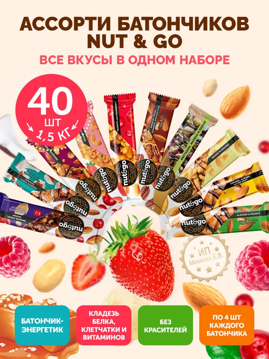 Ассорти всех вкусов полюбившихся всем шоколадных батончиков Nut and Go - идеальная композиция для ценителей вкусных и полезных сладостей. Все вкусы в одном наборе по 4 шт. каждого вида. Всего в наборе 40 батончиков.