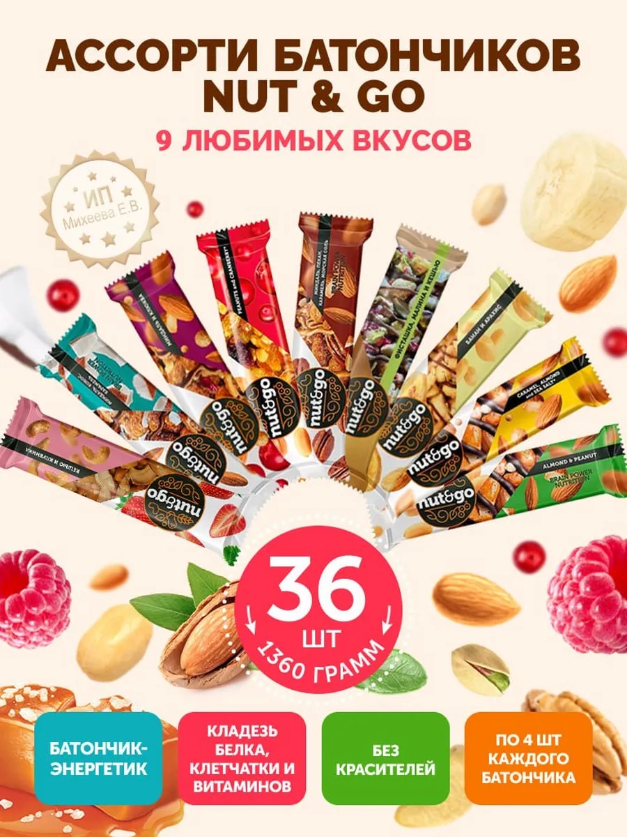 Ассорти 9 вкусов полюбившихся всем шоколадных батончиков Nut and Go - идеальная композиция для ценителей вкусных и полезных сладостей. Любимые вкусы в одном наборе по 4 шт. каждого вида. Всего в наборе 36 батончиков.