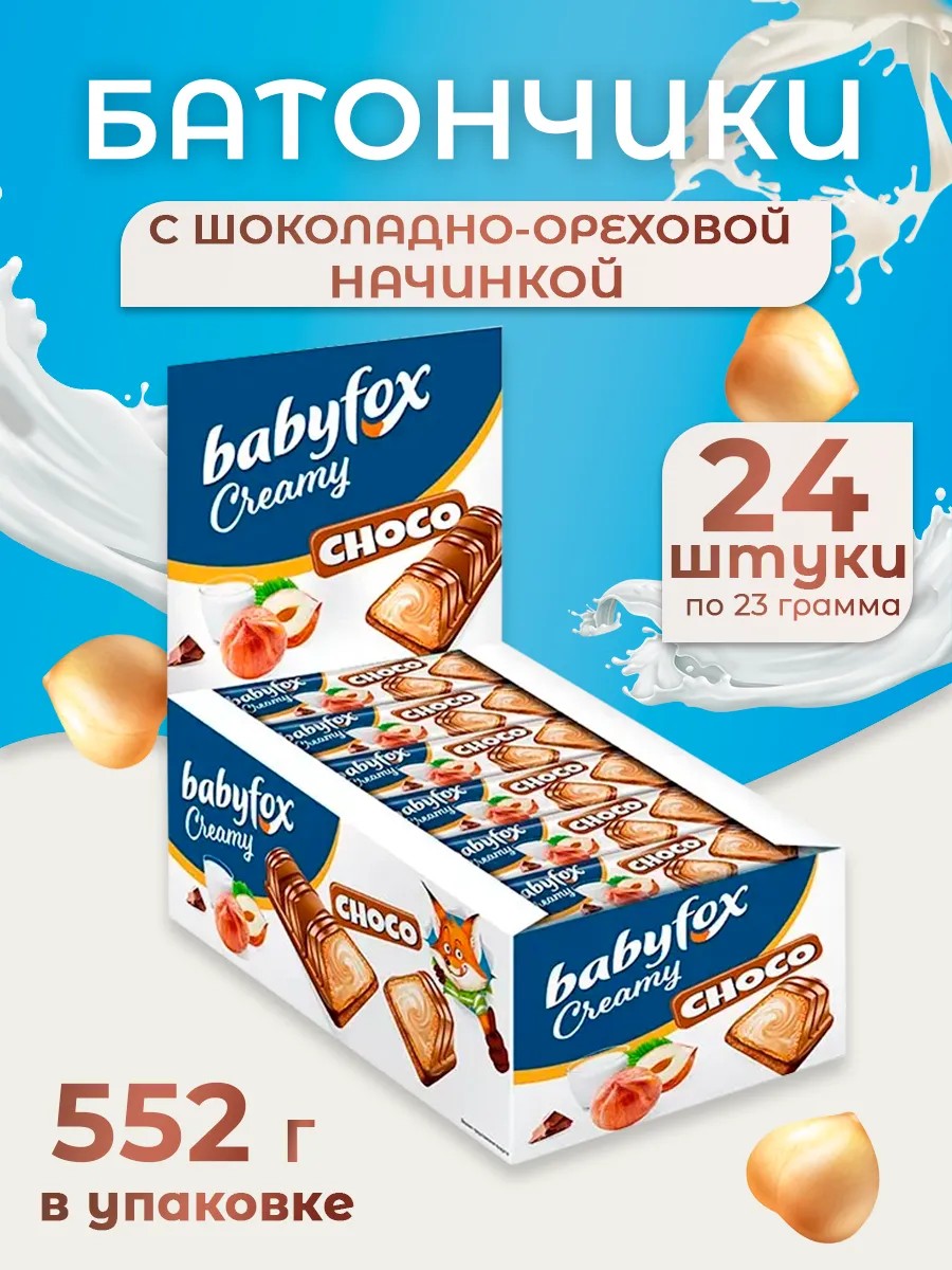 Вафельные батончики Babyfox Creamy Choco c фундуком 24шт- это идеальный вкусный перекус. В упаковке содержится 24 батончика по 23 гр, что делает их удобными для хранения и подходящими для тех, кто хочет иметь перекусы всегда под рукой. Каждый батончик Babyfox выполнен из натурального шоколада и содержит нежную фундучную начинку. Молочная шоколадная масса содержит: общий сухой остаток какао – не менее 30 %. Темная шоколадная масса содержит: общий сухой остаток какао – не менее 52 %. Babyfox - это универсальный десерт, который подойдет как для взрослых, так и для детей. Они идеально подходят в качестве перекуса в школу или детский сад, или просто чтобы порадовать себя в любое время дня. Батончики Babyfox также станут отличным подарком на различные праздники, такие как 23 февраля или 8 марта. Их стильная упаковка сразу же привлечет внимание и станет сладким сюрпризом для близких и друзей. Вам не нужно выбирать между вкусом и качеством - с шоколадными батончиками Babyfox у вас есть и то, и другое. Не упустите возможность насладиться истинным вкусом натурального шоколада с нежной ореховой начинкой. Попробуйте и вы не сможете остановиться!