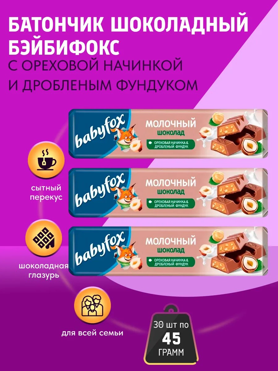 Шоколадный батончик "BabyFox" от КДВ — это идеальное лакомство для любителей нежного молочного шоколада и хрустящих орехов. В каждой плитке 30*45г вас ждет сочетание сливочного молочного шоколада, ароматной ореховой начинки и кусочков фундука. "BabyFox" станет отличным перекусом в течение дня, добавит сладости вашему кофе или чаю, а также порадует детей своим аппетитным вкусом.100% натуральный шоколад с ореховой начинкой. С повышенным содержанием молока – более 25%! – Какао из отборных какао-бобов. – С кусочками отборного фундука. – Помощник для мозга.