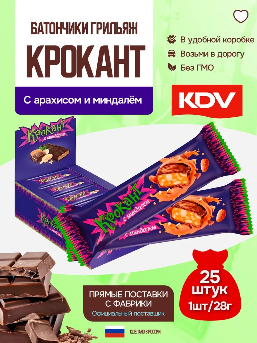 KDV Батончик грильяж Крокант с арахисом и миндалем 25шт по 28г