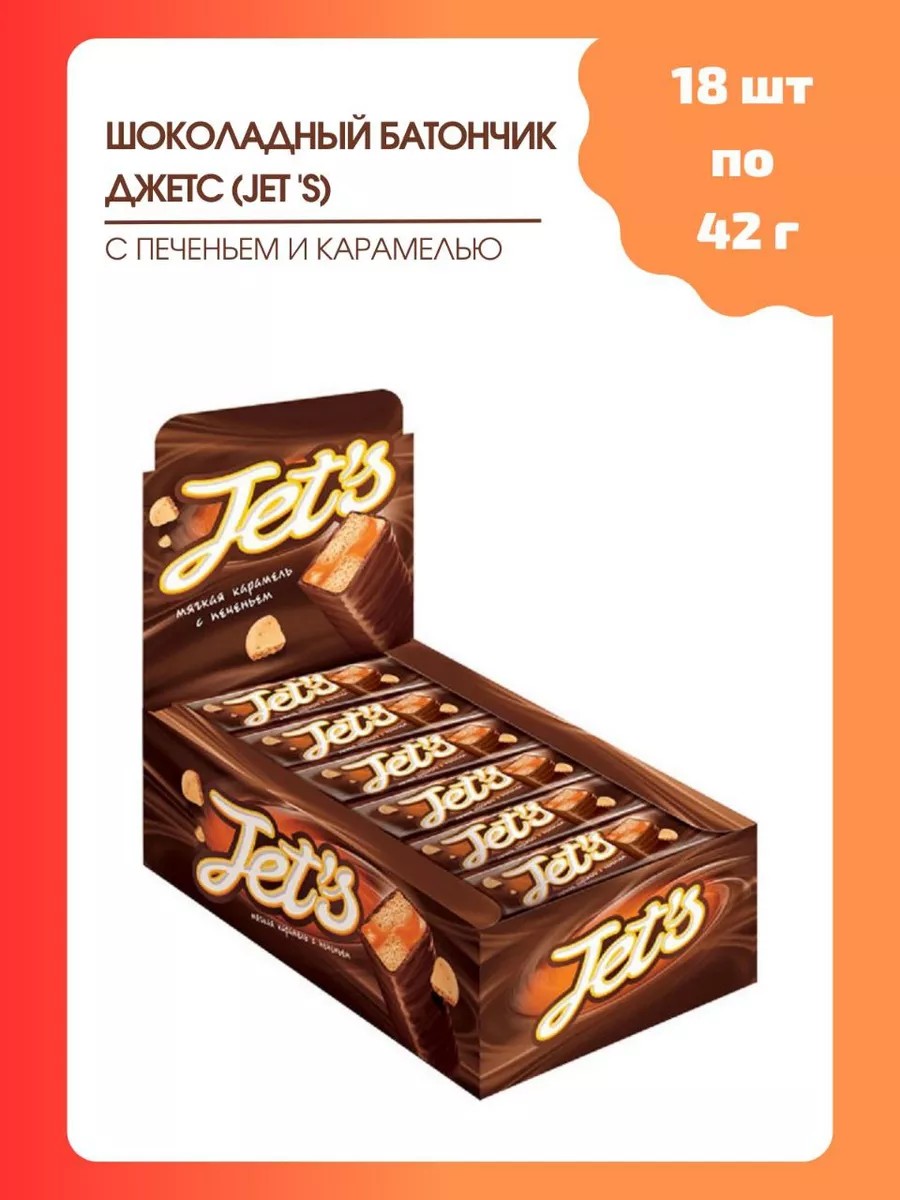Батончик Jet's Джетс из мягкой карамели и сливочного печенья, покрытый глазурью. В шоу-боксе 18 батончиков по 42 гр. Удобно взять с собой, для детей и взрослых, для семейного чаепития. Состав продукта: патока, сахар, масла растительные (пальмовое, пальмоядровое, подсолнечное, соевое, эмульгаторы: сорбитан тристеарат, моно- и диглицериды жирных кислот, соевый лецитин, ароматизатор, краситель: каротины (бета-каротин), антиокислители: аскорбиновая кислота, альфа-Токоферол); мука пшеничная, сыворотка молочная сухая деминерализованная, какао-порошок, соль, молоко цельное сгущенное с сахаром (молоко цельное, молоко обезжиренное, сахар (сахароза), лактоза); эмульгатор: лецитин соевый; разрыхлители: гидрокарбонат аммония, гидрокарбонат натрия; ароматизаторы, эмульгатор: Е476, регулятор кислотности: кислота лимонная. Может содержать диоксид серы, следы яиц, арахиса, кунжутного семени, орехов и продуктов их переработки.