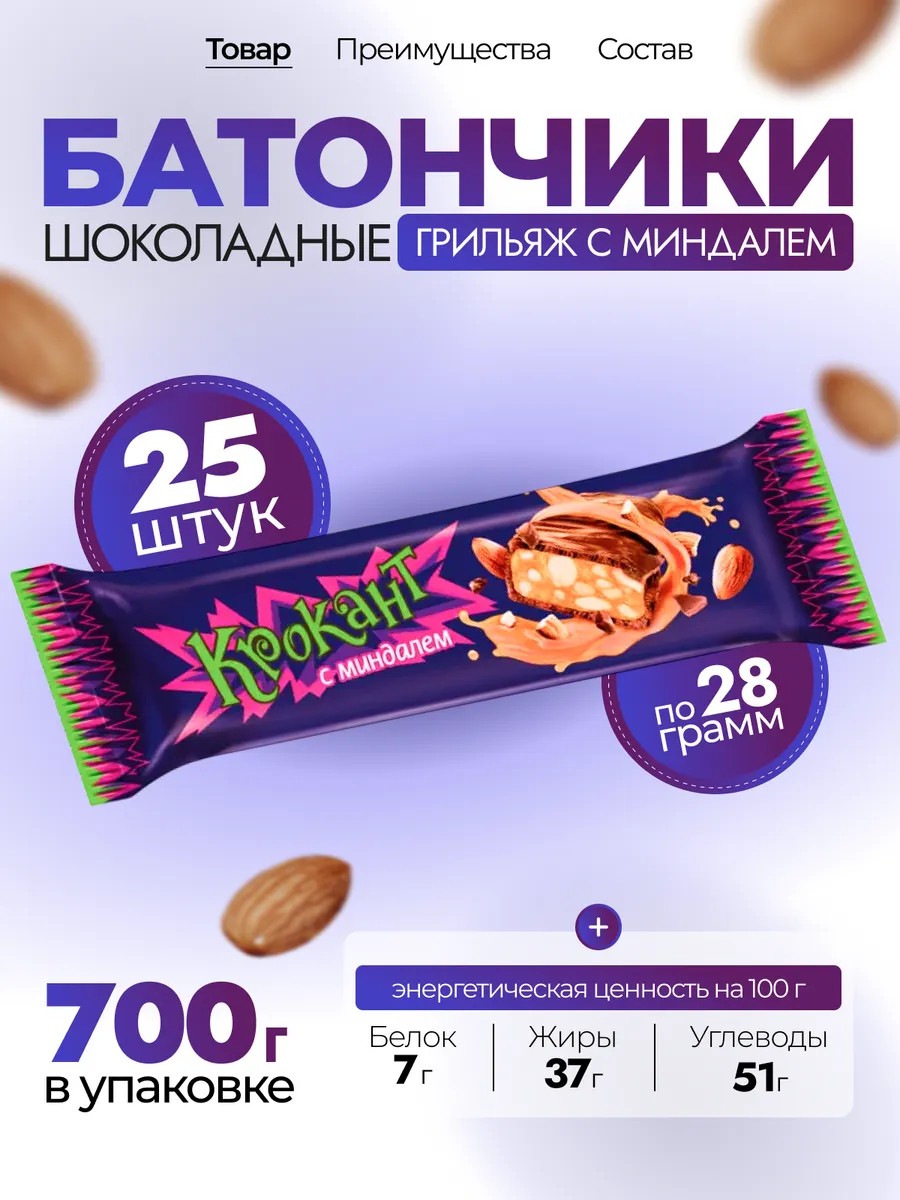 | Состав | сахар; патока; масла растительные; какао-порошок; соль; сыворотка молочная сухая деминерализованная; ядра арахиса жареные; миндаль обжаренный дробленый |