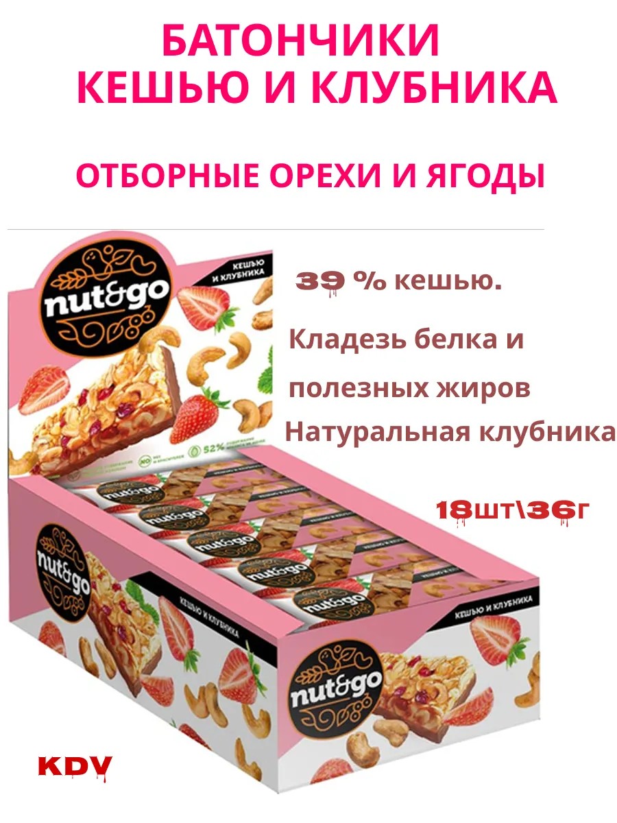 KDV Батончик Nut&go Кешью и клубника, 18 штук по 36г