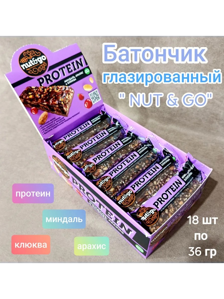 КомплектацияБатончик NUT&GO протеин, миндаль, арахис и клюква 36 гр - 18 шт