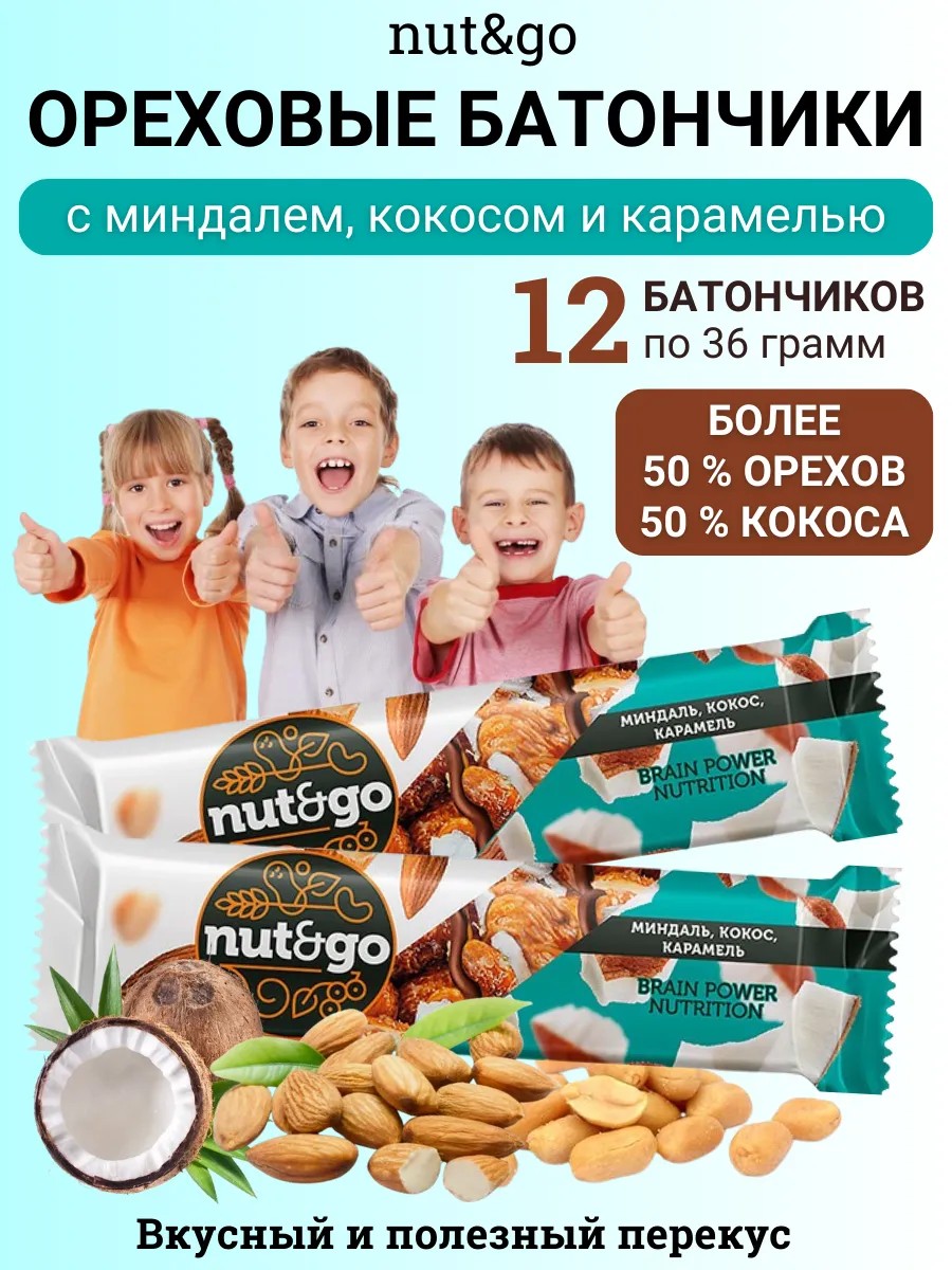 | Состав | ядра миндаля обжаренные; глюкозные сиропы, сахар, кокосовые чипсы (кокосовая мякоть); масла растительные (эмульгатор: сорбитан тристеарат); мальтодекстрин (содержит консервант: диоксид серы); влагоудерживающий агент: сорбитовый сироп; сыворотка молочная сухая деминерализованная; какао-порошок, соль, эмульгаторы: лецитины соевые, Е476; ароматизаторы; батончики набор; батончики nut&go; Nut and go миндаль кокос |