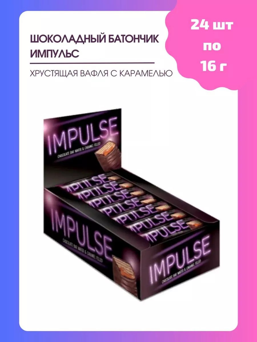 Шоколадный батончик Impulse - это хрустящая вафля в карамели и молочно-шоколадной глазури. В коробке 24 батончика по 16 гр. Удобно взять с собой. Десерт для семейного чаепития, к чаю и кофе. Состав: сахар, масла растительные, молоко цельное сгущенное с сахаром (молоко цельное, молоко обезжиренное, сахар (сахароза), лактоза); мука пшеничная в/с, патока, какао тертое, вода питьевая, молоко сухое цельное, какао-порошок, сыворотка сухая молочная, эмульгаторы: лецитины, Е476, моно- и диглицериды жирных кислот; регуляторы кислотности: гидрокарбонат натрия, лимонная кислота; соль, крахмал кукурузный, ароматизаторы, продукты яичные, разрыхлитель: гидрокарбонат аммония; антиокислитель: Е306. Может содержать диоксид серы, следы арахиса, орехов.