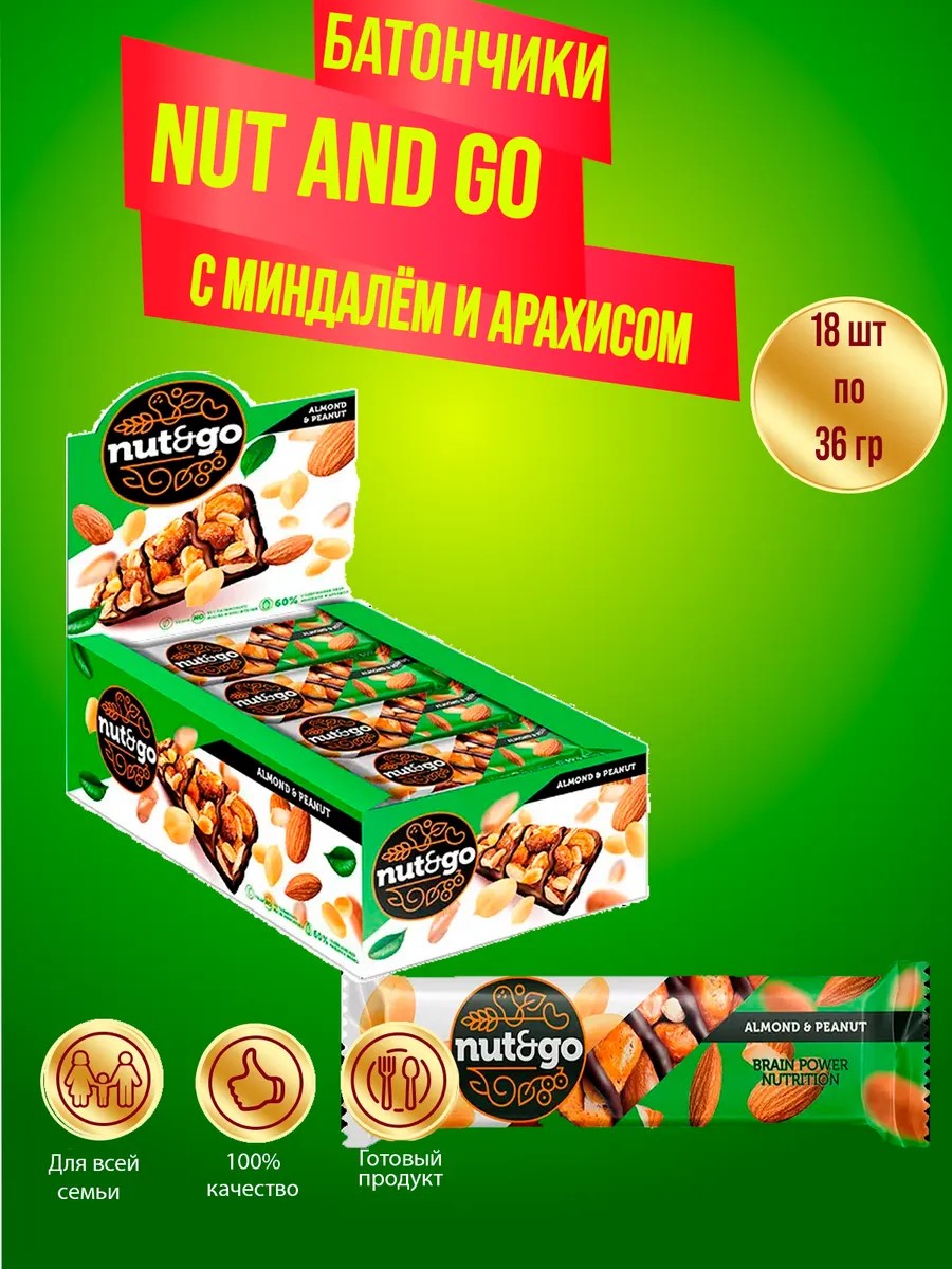 Батончик Nut and Go с миндалём и арахисом, 36 гр
