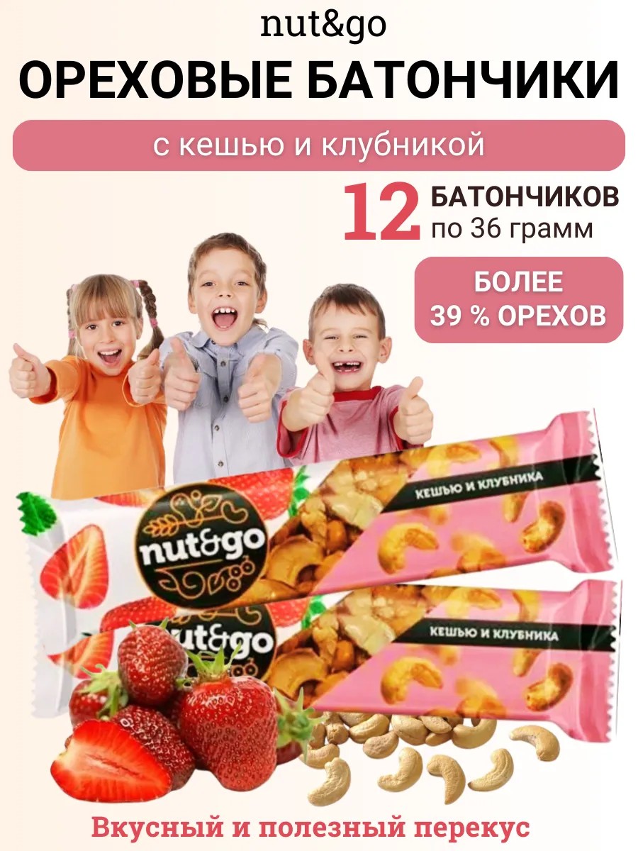 | Ingredients | Roasted cashew kernels; glucose syrups; sugar; vegetable oils; wheat flour; maltodextrin; demineralized whey powder; humectant: sorbitol syrup; cocoa powder; rice flour; salt; acidity regulator: citric acid; nut&go bar; energy bars; nut&go bars; maternity hospital snack; weight loss bars; nut&go bar; Nut and go strawberry |