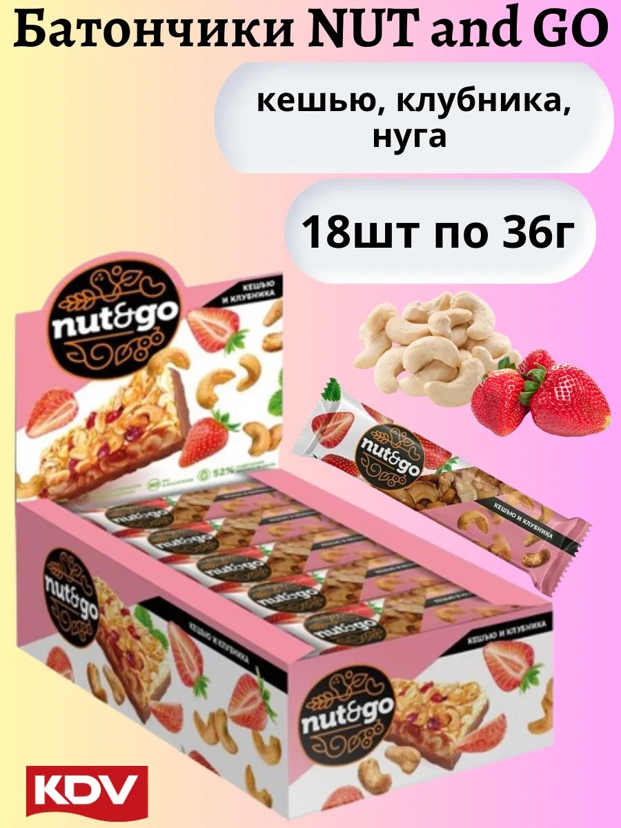 Батончики Nut&Go кешью и клубник от KDV. Шоубокс 18 штук по 36 гр.Батончик-антидепрессант! Ботончик с орехами кешью и вяленой клубникой. Не менее 39 % кешью. Кладезь белка, клетчатки и витаминов. Без холестерина, красителей и консервантов. KDV батончик - много много орнхов, много много кусочков фруктов! В составе крупные кусочки кешью, сочная клубника добавляют натуральной свежести, шоколад в этом изделии не только увеличивает энергетику, но и обеспечивает приятный аромат, обеспечивая отличное настроение на весь день. Запах приятный и вкусный. Злаковый батончик является настоящим кладезем белка, клетчатки и витаминов. Батончик цельный, не разваливается. Это продукт подходит как взрослым людям, так и детям в любом возрасте. Nut and Go ореховый – отличный вариант для вкусного и полезного перекуса в любой ситуации: на занятиях, в офисе, на прогулке или в дороге.Батончики nut&go из орехов – не только отличный перекус, но и хороший презент на случай, если ребенку придется идти в гости или «на чай». Батончик подарит детям отличное настроение и массу калорий, так нужных каждому активно растущему ребенку. Батончики – отличный перекус на работе, на учебе или на прогулке! Они подходят для тех, кто всегда в движении, кто придерживается правильного питания. Батончики ореховые можно взять всегда с собой, они поместятся и в дамскую сумку, и в спортивный рюкзак. Можно поделится с друзьями или подарить вкусный подарок близкому человеку. Батончики злаковые идеальная еда на перекус, наполняющая энергией и позитивом! С ними вы можете порадовать коллег на работе, угостить любимых здоровым перекусом. Это оригинальный и необычный подарок для ваших близких и друзей. Батончики станет прекрасным дополнением к подарку, порадует ваших коллег даже без повода. Это вкусняшки, которые великолепно дополнят любой подарочный набор и сладкий бокс. Здоровое и правильное питание.