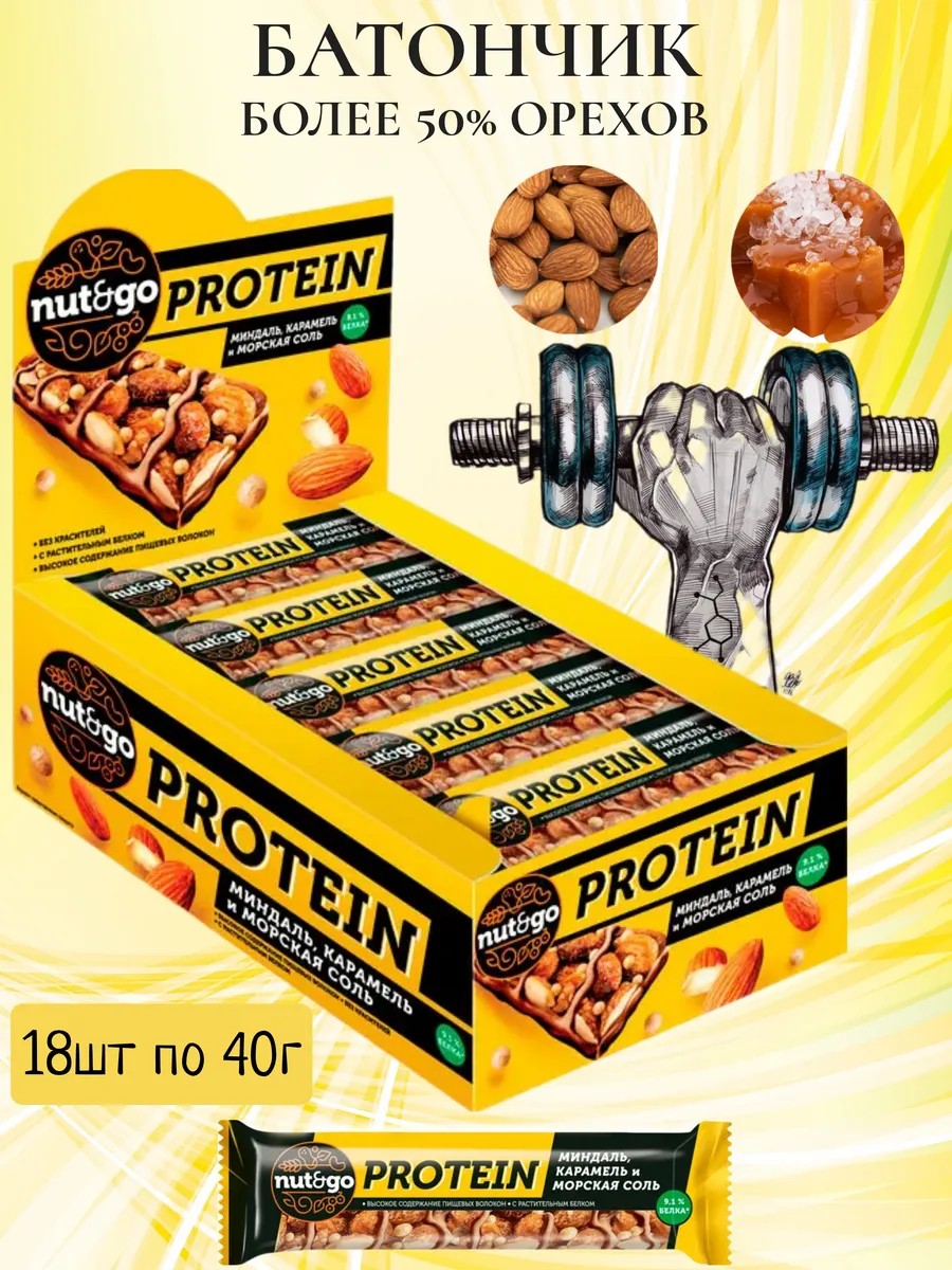 | Количество предметов в упаковке | Протеиновый батончик Nut Go миндальный - 18 шт |