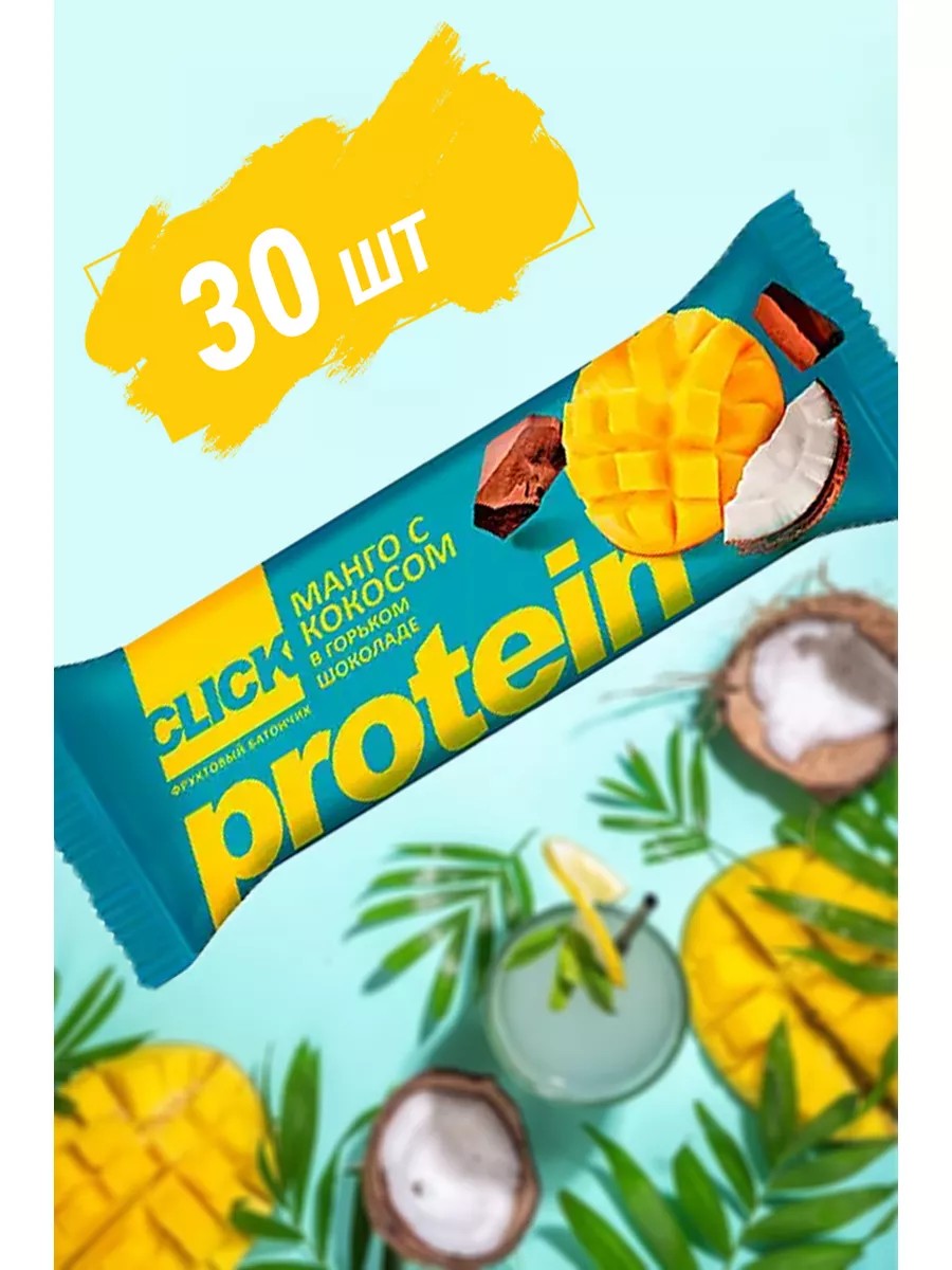 Фруктовый батончик с протеином Click Манго с кокосом, в горьком шоколаде.