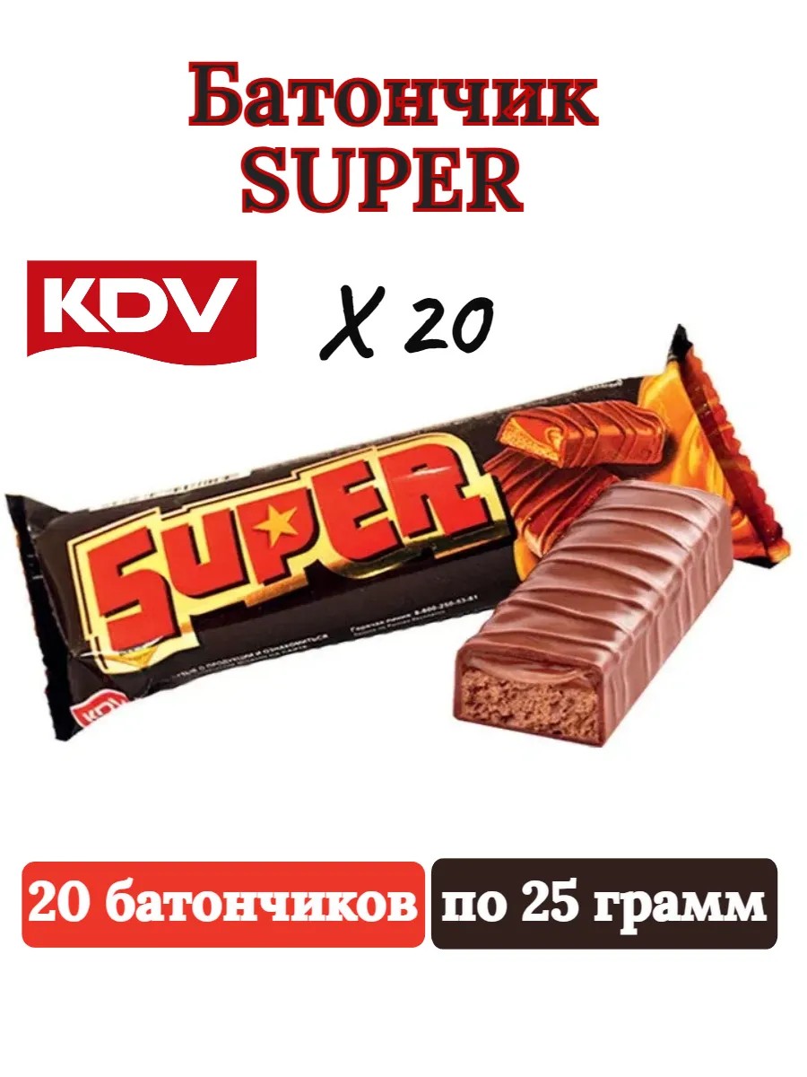 Батончик Super от KDV — это идеальное сочетание нежного молочного шоколада, и ароматной нугой. Каждая из 18 порционных упаковок весом 40 грамм станет отличным перекусом в течение дня. Батончик Super создан из отборных какао-бобов и цельного молока, без добавления ГМО и усилителей вкуса. Он порадует вас своим насыщенным вкусом и подарит заряд бодрости благодаря 30% содержанию какао. Удобно брать с собой на работу, в школу, прогулку, в дорогу. Состав продукта: патока, сахар, масла растительные (эмульгаторы: сорбитан тристеарат; соевый лецитин); сыворотка молочная сухая деминерализованная, какао-порошок, продукты яичные, концентрат (экстракт) ячменно-солодовый (солод ячменный, ячмень, вода); эмульгаторы: лецитины (рапсовый/соевый); Е476; молоко цельное сгущённое с сахаром (молоко цельное, молоко обезжиренное, сахар (сахароза), лактоза); соль, ароматизаторы. Возможно наличие глютена, продуктов переработки арахиса и орехов.