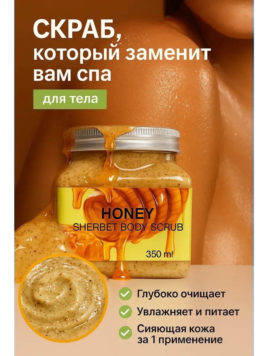 | Полное наименование товара | Скраб для тела с мёдом, морской солью и маслом ши, отшелушивающий, увлажняющий, 350 мл |