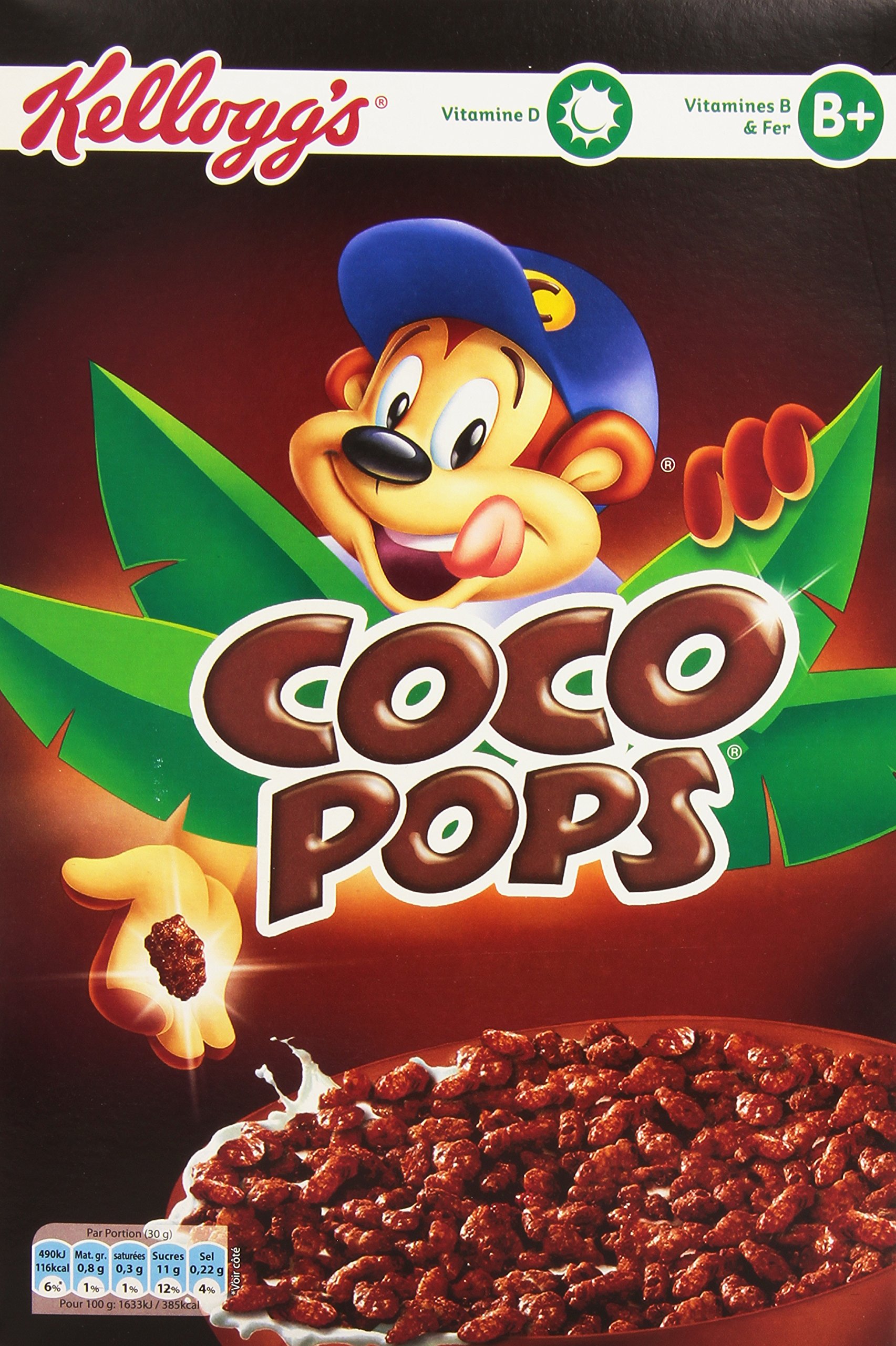 Puffed rice grains with a delicious chocolate flavor. Rice, sugar, chocolate (4 ) (sugar, cocoa mass), fat-reduced cocoa powder, salt, barley malt extract, flavoring Vitamins and Minerals: calcium carbonate, vitamins (PE B6, B2, Bl, B9, D, B12), iron. Possible traces: Gluten. Unit product EAN 5053827101493.Brand: Kellogg's. Kellogg's Coco Pops. Grains de riz soufflés au bon goût de chocolat. Riz, sucre, chocolat (4 ) (sucre, pâte de cacao), cacao maigre en poudre, sel, extrait de malt d'orge, arôme Vitamines et Minéraux: carbonate de calcium, vitamines (PE B6, B2, Bl, B9, D, B12), fer. Traces éventuelles: Gluten. Produit unitaire EAN 5053827101493.Marque: Kellogg's. Kellogg's Coco Pops.