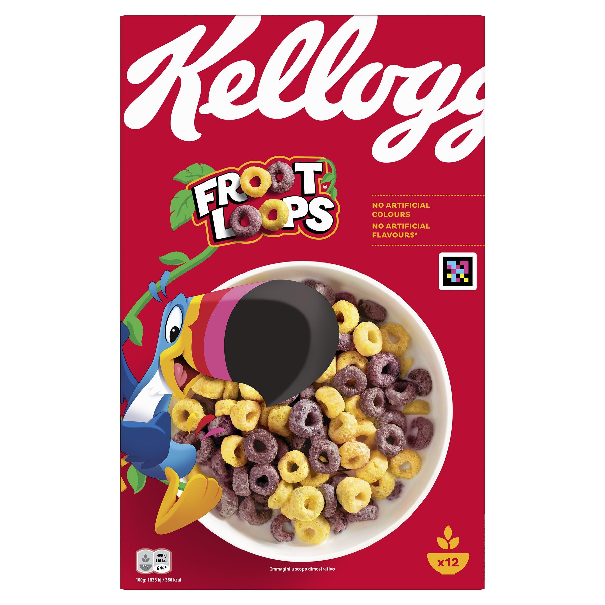 Fun and colorful breakfast with Froot Loops. These fun, colorful cereal rings with delicious fruit flavors bring more fun and color to the breakfast table. With the great fruity taste of Kellogg's Froot Loops, nothing stands in the way of a colorful day. Discover the more colorful side of life with Sam the toucan with his multicolored feathers. The crunchy cereal has a taste of natural fruit flavors and contains no artificial colors or flavors. For a colorful day: Crunchy cereal. Fruity flavor. No artificial colors or flavors. Contents: 6 x 375 g. INGREDIENTS Ingredients: Cereal flours (wholemeal, wheat, corn), sugar, glucose syrup, salt, natural citrus flavoring with other natural flavorings, fruit and vegetable concentrates (radish, apple, blackcurrant, carrot, cherry), coloring (carotene). INSTRUCTIONS Pour 375 g (1 cup) of cereal into a bowl. Add 180 ml (3 4 cup) of cold milk or your preferred amount. Enjoy immediately. See moreKellogg's Froot Loops Céréales pour petit-déjeuner (1 x 375 g) – Céréales colorées de blé, d'avoine et de maïs au goût des fruits – sans colorants ni arômes artificiels 375 g (1 Pack)DESCRIPTION DU PRODUIT DESCRIPTION DU PRODUIT Amusant petit déjeuner coloré avec Froot Loops. Les anneaux de céréales colorés amusants avec de délicieux arômes de fruits apportent plus de plaisir et de couleur à la table du petit-déjeuner. Avec le superbe goût de fruits de Kellogg's Froot Loops, plus rien ne s'oppose à une journée colorée. Découvrez le côté plus coloré de la vie avec le toucan Sam à plumes multicolores. Les céréales croustillantes ont un goût d'arômes de fruits naturels et ne contiennent pas de colorants ni d'arômes artificiels. Pour une journée colorée : Céréales croustillantes. Saveur fruitée. Sans colorants ni arômes artificiels. Contenu : 6 x 375 g. INGRÉDIENTS Ingrédients: farines de céréales(BOUGON COMPLETE, BLÉ, maïs), sucre, sirop de glucose, sel, arôme naturel d'agrumes avec d'autres arômes naturels, concentrés de fruits et de légumes(radis, pommes, cassis, carottes, cerises), colorant(carotène). MODE D'EMPLOI Versez 375 g (1 tasse) de céréales dans un bol. Ajoutez 180 ml (3 4 tasse) de lait froid ou votre quantité préférée. Profitez-en immédiatement. Voir plus