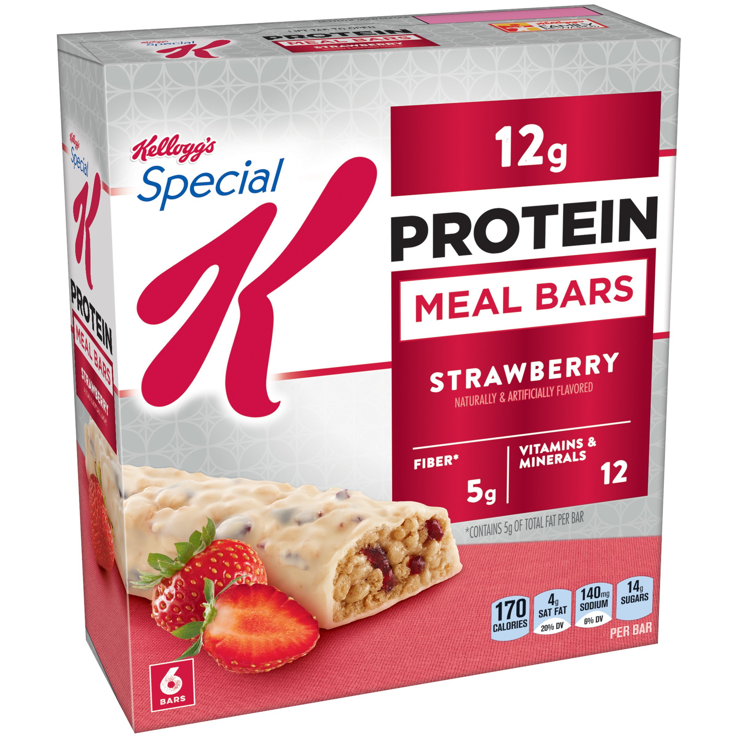 With 10 grams of satisfying protein and 5 grams of fiber, tasty strawberry special k protein meal bars can help you get the shape you want. Bite into the crisp crunchy rice goodness and discover strawberry flavored fruit pieces all wrapped in creamy coating. Since 1906, Kellogg's has provided delicious, ready to eat cereal to help families start their morning right. Kellogg's cocoa krispies is crispy rice cereal sweetened with sugar and flavored with real chocolate. This low fat, no cholesterol, chocolaty breakfast cereal is an excellent source of essential nutrients. Serve cocoa krispies with milk for even more nutrition, lactose intolerant individuals can try cocoa krispies with calcium enriched soy milk or rice milk. Prepackaged individual servings makes it easy to take this nutritious breakfast to the workplace or to school which means there's no excuse for missing breakfast. SPECIAL K STRAWBERRY PROTEIN MEAL BARS Packed with crispy, crunchy rice, pieces of strawberry-flavored fruit, and dipped in creamy goodness--Special K Strawberry Protein Meal Bars are the perfect snack or meal replacement bar for berry lovers. With ten grams of protein and five grams of fiber to help you stay satisfied and energized, and at a reasonable 170 calories per bar, Strawberry Protein Meal Bars can help you stay on tract with your goals. SIMPLE STEPS TO IMPROVED FOOD HABITS Start Out on the Right Foot: Studies have shown that when you make the right food choices at the beginning of the day, you are more likely to make good decisions the rest of the day. Eating a Special K Meal Bar for breakfast or as a mid-morning snack provides the protein you need to stay energized and will keep you from indulging in less healthy options. Take Control of Your Portions: In order to eat healthfully it is essential to pay attention to portion size. Individually wrapped Special K Meal Bars provide a nutritious meal replacement that will also satisfy your sweet tooth in one 170-calorie serving. Easy to pop into a lunchbox, a backpack or purse, Special K Meal Bars provide a great option for nutritious eating on the go. TAKE THE SPECIAL K CHALLENGE For Special K lovers hoping to trim down, Kellogg has created the Special K Challenge, a fun and easily managed online program found at specialk.com. Designed to help set and achieve weight loss goals, the program includes useful suggestions, menu tips, mobile apps, recipes, and online community features. Special K cereal bars are in the snack category of the program, providing a tasty way to stay satisfied without getting off track. A HEALTHY HISTORY Founded by W. K. Kellogg in Battle Creek, Michigan, in 1906, the Kellogg Company is dedicated to making good nutrition easy and appealing for active professionals and busy families. Its Special K line now includes a delicious variety of cereals, breakfast bars, snack crackers, and beverages. ABOUT KELLOGG Kellogg Company is a leading producer of cereal and convenience foods--a company you can rely on for great-tasting, high quality foods. Kellogg was founded in 1906, in Battle Creek, Michigan. For more than 100 years, innovation and their commitment to being the best has guided the company. From being the first company to offer premiums in cereal boxes to being the first to fortify the cereals, Kellogg has historically been a leader in industry, innovation, and marketing. The founder, W.K. Kellogg, had a strong commitment to nutrition, health, and quality. His vision continues to drive improvement in the products and processes, with the goal of providing great-tasting, nutritious products that meet the most rigorous quality standards. With more than 100 ready-to-eat cereals around the world, consumers count on Kellogg for great-tasting, convenient, and affordable choices that meet their nutrition needs.190 calories per bar 0 grams trans fat. 10 grams of protein per serving. Strawberry protein meal bar. Pack of 3 (total 18 count).