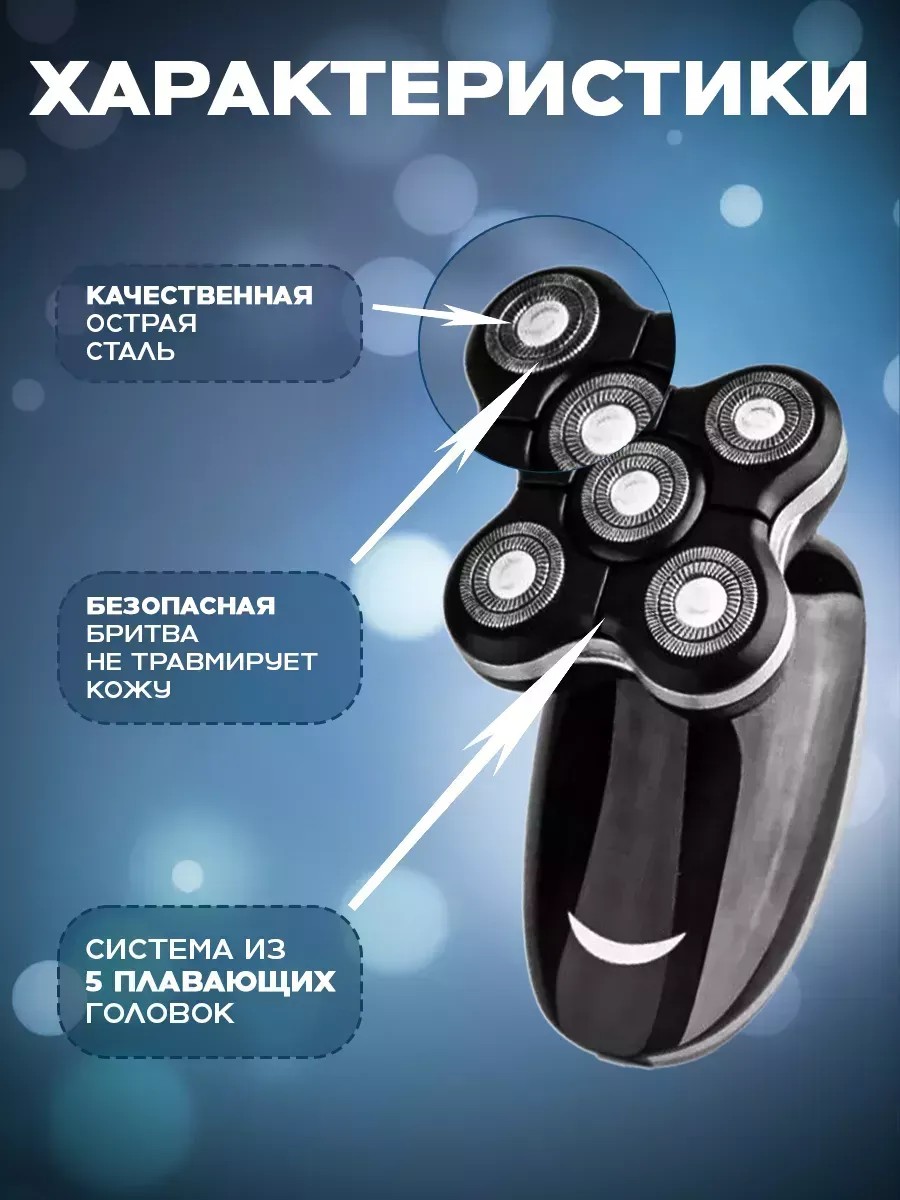 Откройте для себя современное решение для безупречного бритья с нашей многофункциональной электробритвой. Благодаря пяти плавающим головкам устройство идеально повторяет контуры лица, обеспечивая максимально точное и комфортное бритье без раздражений. Высококачественные самозатачивающиеся лезвия из немецкой стали гарантируют долговечность и безопасность использования. Эта бритва подходит для сухого и влажного бритья, что позволяет выбрать наиболее комфортный способ ухода за кожей. В комплект входит насадка для стрижки волос, несколько гребней для выбора длины и триммер для носа и ушей, что делает устройство универсальным инструментом для ухода. Мощный литий-ионный аккумулятор обеспечивает быструю зарядку и длительную работу, а многоуровневый светодиодный дисплей информирует о состоянии батареи и необходимости подзарядки. Простота в уходе и возможность использования с различными средствами для чувствительной кожи делают эту электробритву идеальным выбором для мужчин, заботящихся о своем внешнем виде. Обновите свой ежедневный ритуал ухода и наслаждайтесь высоким качеством и комфортом каждый день, заказав нашу современную электробритву.