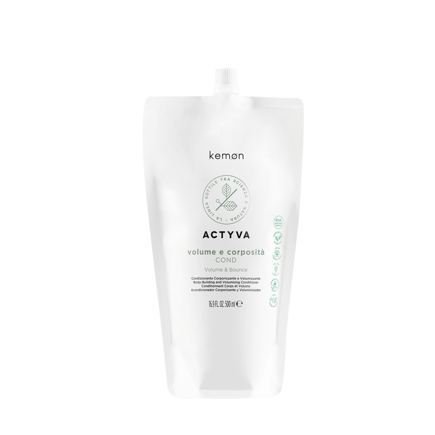 Silicone-free volumizing conditioner for fine hair. Lightweight, fluid texture makes detangling easier and adds lightness and fullness. Green Clean certified, ICEA Vegan, 94 natural ingredients. INGREDIENTS Aqua (WATER EAU), CETYL ALCOHOL, QUATERNIUM-87, BEHENTHUM CHLORIDE, STEARYL ALCOHOL, GLYCERIN, STEARAMIDOPROPYL DIMETHYLAMINE, PARFUM (FRAGRANCE), PROPYLENE GLYCOL, DICAPRYLYL ETHER, PISUM SATIUM (PEPTIMUM) OIL. DE (PISUM SATIVUM (PEA) PEPTIDE), ETHYLTRIMONIUM CHLORIDE METHACRYLATE HYDROLYZED WHEAT PROTEIN COPOLYMER, LACTIC ACID, SODIUM PCA, HYDROLYZED WHEAT PROTEIN, HYDROLYZED SOY PROTEIN, PANTHENOL, PRUNUS AMYGDALUS DULCIS OIS IL (Prunus. AMYGDALUS DULCIS (SWEET ALMOND) OIL), LINUM USITATISSIMUM SEED EXTRACT (LINUM USITATISSIMUM (LINSEED) SEED EXTRACT) , VERBASCUM DENSIFLORUM FLOWER STEM EXTRACT , HELICHRYSUM ITALIUM EXTRACT , COTA Tincture FLOWER. Leaf Steps M EXTRACT , TILIA TOMENTOSA BUD EXTRACT, CITRIC ACID, CAPRYLYL GLYCOL, DISODIUM EDTA, PHENOXYETHANOL, BENZYL ALCOHOL, SODIUM benzoate, POTASSIUM SORBATE, HEXYL CINNAMAL, CITRONELLOL SAFETY WARNING For external use only. Avoid contact with eyes. See moreVolumizing action. Leaves hair soft and heavy. Adds lightness and fullness. Makes detangling easier. Conditioner to give hair volume.Kemon - Actyva Volume et Corposité Cond, Baume pour Cheveux Fins à Action Volumisant avec Graines de Lin, Sans Silicone - 500 mlDESCRIPTION DU PRODUIT DESCRIPTION DU PRODUIT Conditionneur volumateur sans silicone pour cheveux fins. Texture fluide légère, facilite le démêlage et apporte légèreté et plénitude. Certifié Green Clean, ICEA Vegan, 94 ingrédients naturels. INGRÉDIENTS Aqua (WATER EAU), CETYL ALCOHOL, QUATERNIUM-87, BEHENTHUM CHLORIDE, STEARYL ALCOHOL, GLYCERIN, STEARAMIDOPROPYL DIMETHYLAMINE, PARFUM (FRAGRANCE), PROPYLENE GLYCOL, DICAPRYLYL ETHER, PISUM SATIUM. VUM PEPTITI. DE (PISUM SATIVUM (PEA) PEPTIDE), ETHYLTRIMONIUM CHLORIDE MÉTHACRYLATE HYDROLYZED WHEAT PROTEIN COPOLYMER, LACTIC ACID, SODIUM PCA, HYDROLYZED WHEAT PROTEIN, HYDROLYZED SOY PROTEIN, PANTHENOL, PRUNUS AMYGDALUS DULCIS OIS IL (Prunus. AMYGDALUS DULCIS (SWEET ALMOND) OIL), LINUM USITATISSIMUM SEED EXTRACT (LINUM USITATISSIMUM (LINSEED) SEED EXTRACT) , VERBASCUM DENSIFLORUM FLOWER STEM EXTRACT , HELICHRYSUM ITALIUM EXTRACT , COTA Teinture FLOWER. Leaf Steps M EXTRACT , TILIA TOMENTOSA BUD EXTRACT, CITRIC ACID, CAPRYLYL GLYCOL, DISODIUM EDTA, PHENOXYETHANOL, BENZYL ALCOHOL, SODIUM benzoate, POTASSIUM SORBATE, HEXYL CINNAMAL, CITRONELLOL AVERTISSEMENT DE SÉCURITÉ Usage extérieur uniquement. Évitez tout contact avec les yeux. Voir plusAction volumatante. Laisse les cheveux doux et lourds. Apporte légèreté et plénitude. Facilite le démêlage. Conditionneur pour donner du volume aux cheveux.