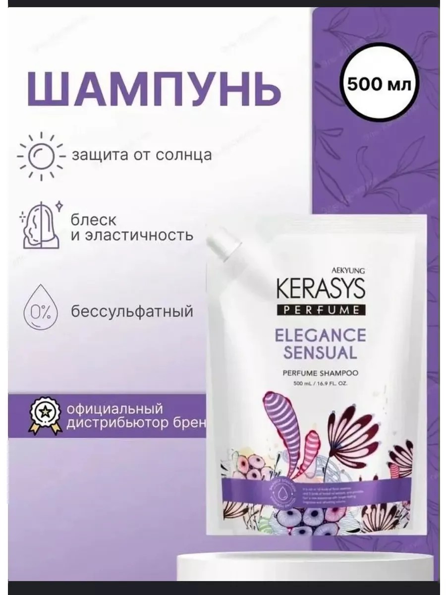 Шампунь парфюмированный для волос Elegance Sensual 500 мл запаска.Специально разработанная формула для тонких И ослабленных волос, укрепляет и восстанавливает структуру волос по всей длине. Волосы обретают жизненную силу, эластичность и объем. Содержит масло оливы и масло ши. Аромат: изысканный и грациозный аромат с нотками лилового цвета для современной и утонченной натуры. Подчеркнет Ваш стиль и элегантность. Парфюмерная композиция: Начальная нота: цветы яблони, ирис. Срединная нота: тубероза, иланг-иланг, фиалка, гиацинт. Конечная нота: сандал, рисовая мука, мускус. Оказывает солнцезащитное действие. Корейский шампунь придаст и вашим волосам красивый и здоровый вид , питая корни и делая структуру волоса шелковистой ! Марка kerasys позаботиться о здоровье ваших волос ! А так же попробуйте наш бальзам Карсил Karssell