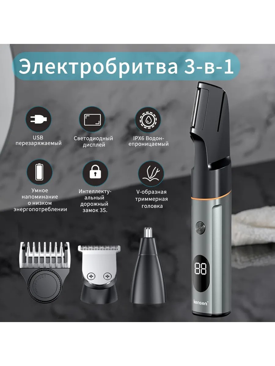 Электробритва Kensen LK-881 – это универсальный мужской триммер 3-в-1, который поставляется с тремя съемными триммерными головками: для тела, для носа и триммером.