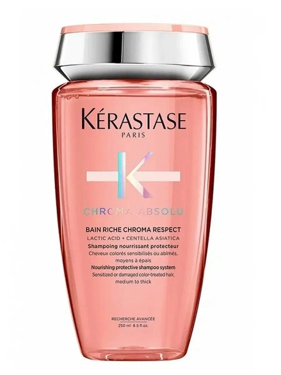 Bain Riche Chroma Respect is a rich, nourishing and protective bath shampoo for all types of color-treated or damaged color-treated hair. Best suited for thick and medium-thickness hair. This light pink, translucent, sulfate-free gel cleanses and nourishes hair, preventing color fading. Lactic acid and centella asiatica help reduce hair porosity, smooth the surface, maximize color retention, and reduce color-induced frizz.