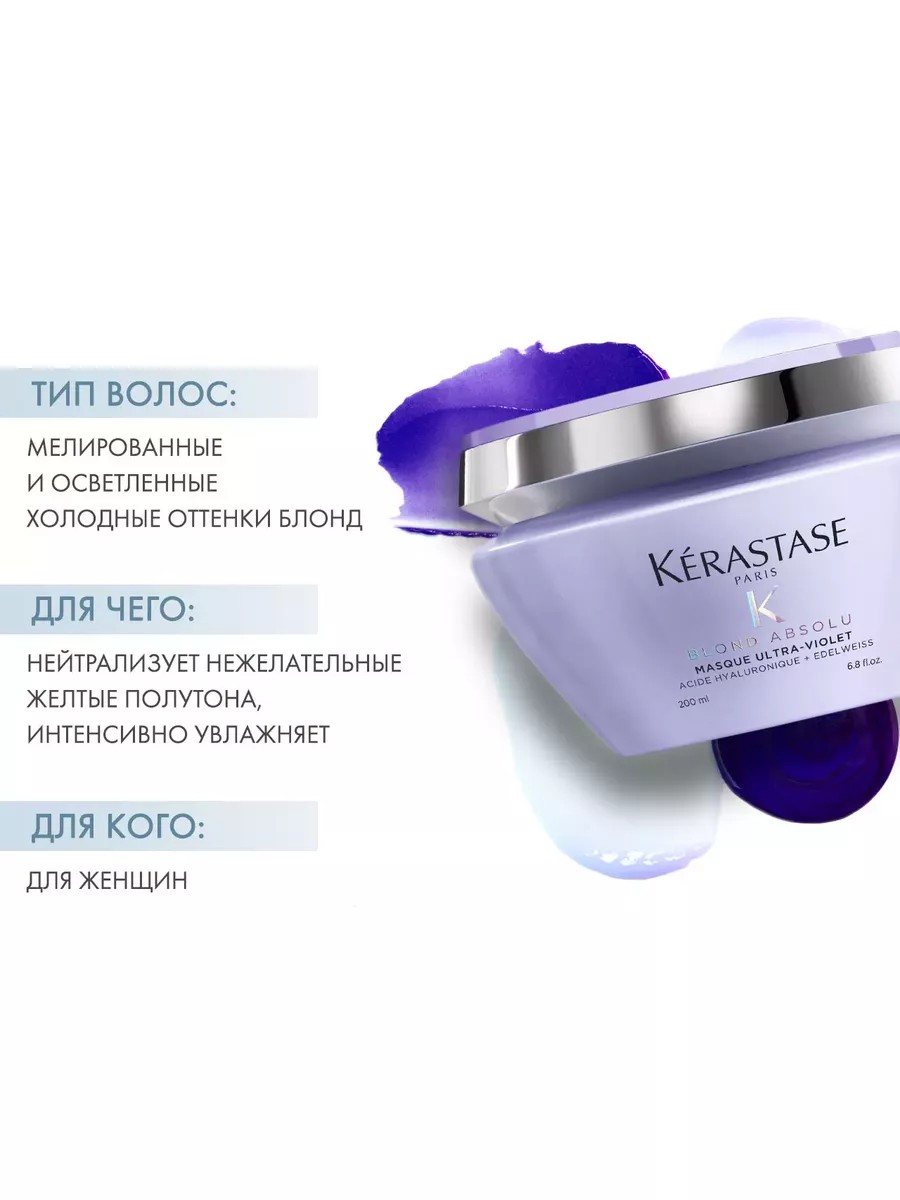 Kerastase BLOND ABSOLU Masque Ultra-Violet - Маска фиолетовая, нейтрализующая желтые полутона подходит для холодных оттенков блонда, мелированных и осветленных волос. Питательная фиолетовая маска нейтрализует нежелательные желтые полутона, интенсивно увлажняя волосы. Уникальное сочетание гиалуроновой кислоты, экстракта цветка эдельвейса и нейтрализующих компонентов: Гиалуроновая кислота известна своими увлажняющими свойствами. В экстракте цветка эдельвейса содержится большое количество антиоксидантов, которые помогают защитить волосы от негативных воздействий окружающей среды.