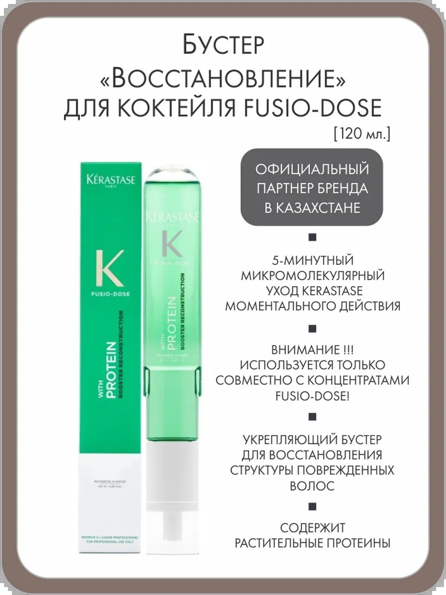 Бустер для восстановления поврежденных волос. На 50% уменьшает ломкость волос, а также придает локонам эластичность и увлажненность. Формула содержит в составе восстанавливающий комплекс «Антиэрозия». Моментально трансформирует фибру волос. В составе средства не содержится ароматизаторов и синтетических консервантов. Используется только в комбинации с концентратами Kerastase. Применение: Использовать средство исключительно с концентратом Fusio-Dose. Наденьте бустер на открытый флакон концентрата Fusio-Dose, прокрутите по часовой стрелке, а затем – против, так, чтобы доза из бустера попала во флакон. Встряхните флакон, чтобы его содержимое стало однородно. Смените бустер дозатором от флакона и распылите жидкость по всей длине предварительно вымытых шампунем влажных волос, прядь за прядью, на расстоянии 10 см. Времени выдержки не требуется. Смыть обильным количеством воды.