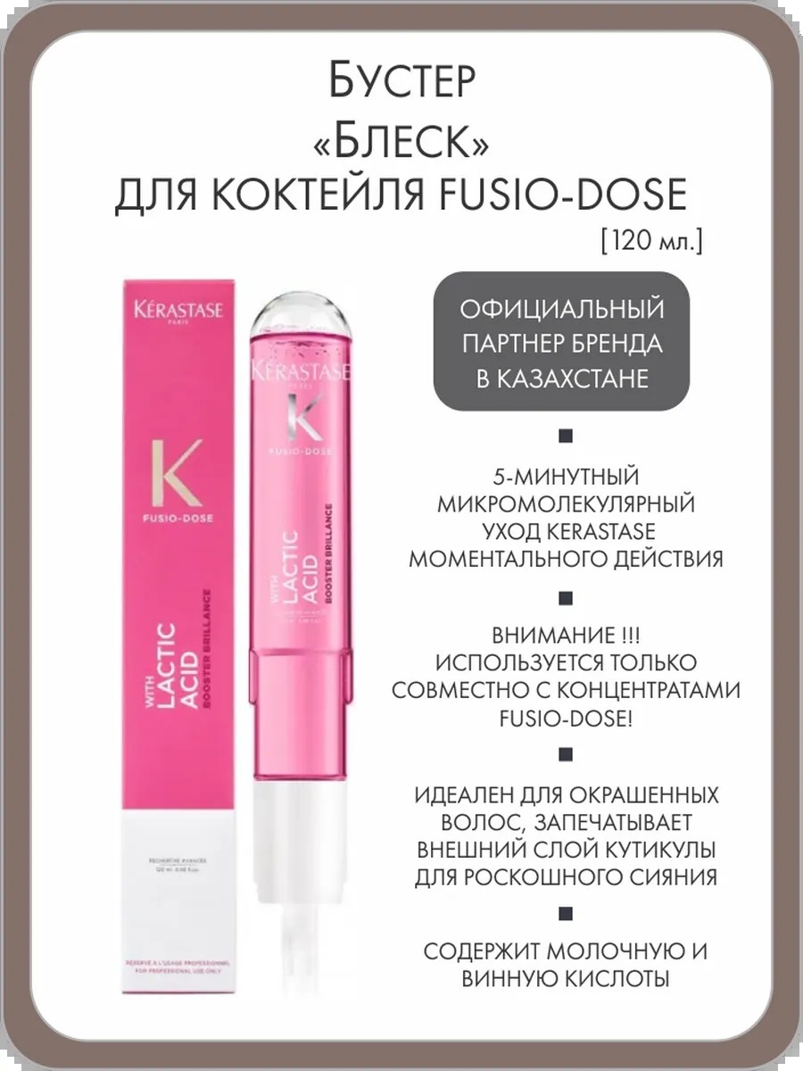 Бустер-блеск для восстановления поверхности волос после окрашивания. Молочная кислота и винная кислота увлажняют наружный слой волос, сохраняют яркость цвета более здоровых, с красивым блеском волос. Результат: на 93% больше увлажненности. Активные компоненты: Молочная кислота + Винная кислота + витамин Е. Применение: Использовать средство исключительно с концентратом Fusio-Dose. Наденьте бустер на открытый флакон концентрата Fusio-Dose, прокрутите по часовой стрелке, а затем – против, так, чтобы доза из бустера попала во флакон. Встряхните флакон, чтобы его содержимое стало однородно. Смените бустер дозатором от флакона и распылите жидкость по всей длине предварительно вымытых шампунем влажных волос, прядь за прядью, на расстоянии 10 см. Времени выдержки не требуется. Смыть обильным количеством воды.