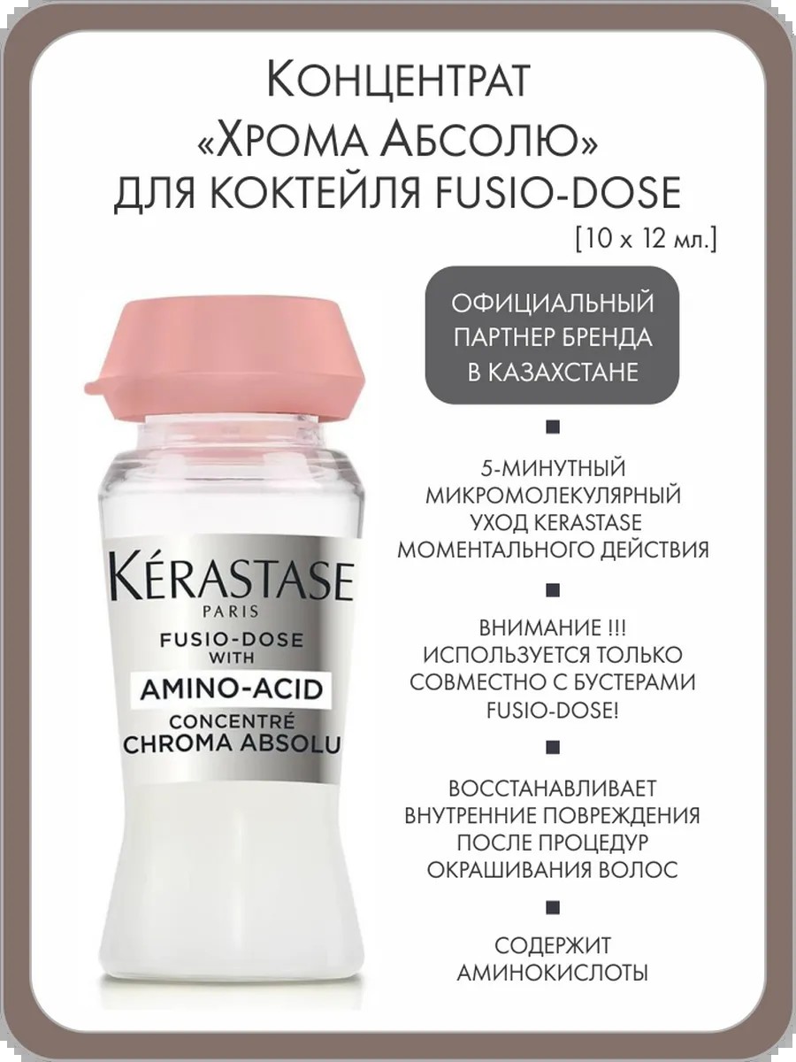 Shine concentrate for color-treated hair care. Nourishing concentrate for restoring the hair core after coloring. Gives hair a vibrant color tone and saturates color-treated hair with shine. Result: 88% more hydration, 41% less damage. Active ingredients: Lactic acid + Asian water navel + Arginine + Vitamin E, Hyaluronic acid. Directions: Use only with the Fusio-Dose booster. Attach the booster to the open bottle of Fusio-Dose concentrate, twist clockwise and then counterclockwise until the dose from the booster enters the bottle. Shake the bottle until its contents are uniform. Replace the booster with the dispenser from the bottle and spray the liquid along the entire length of damp hair, pre-shampooed, strand by strand, from a distance of 10 cm. No development time is required. Rinse with plenty of water.