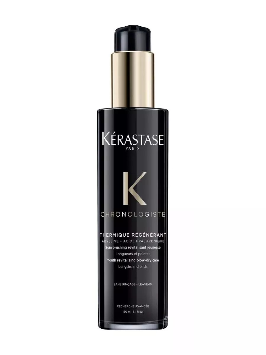 Kerastase Chronologiste Thermique Regenerant, a restorative thermal protection treatment with anti-frizz effect, is used to protect hair from heat damage caused by straightening irons, hair dryers, and other thermal tools, while also strengthening and restoring its structure.