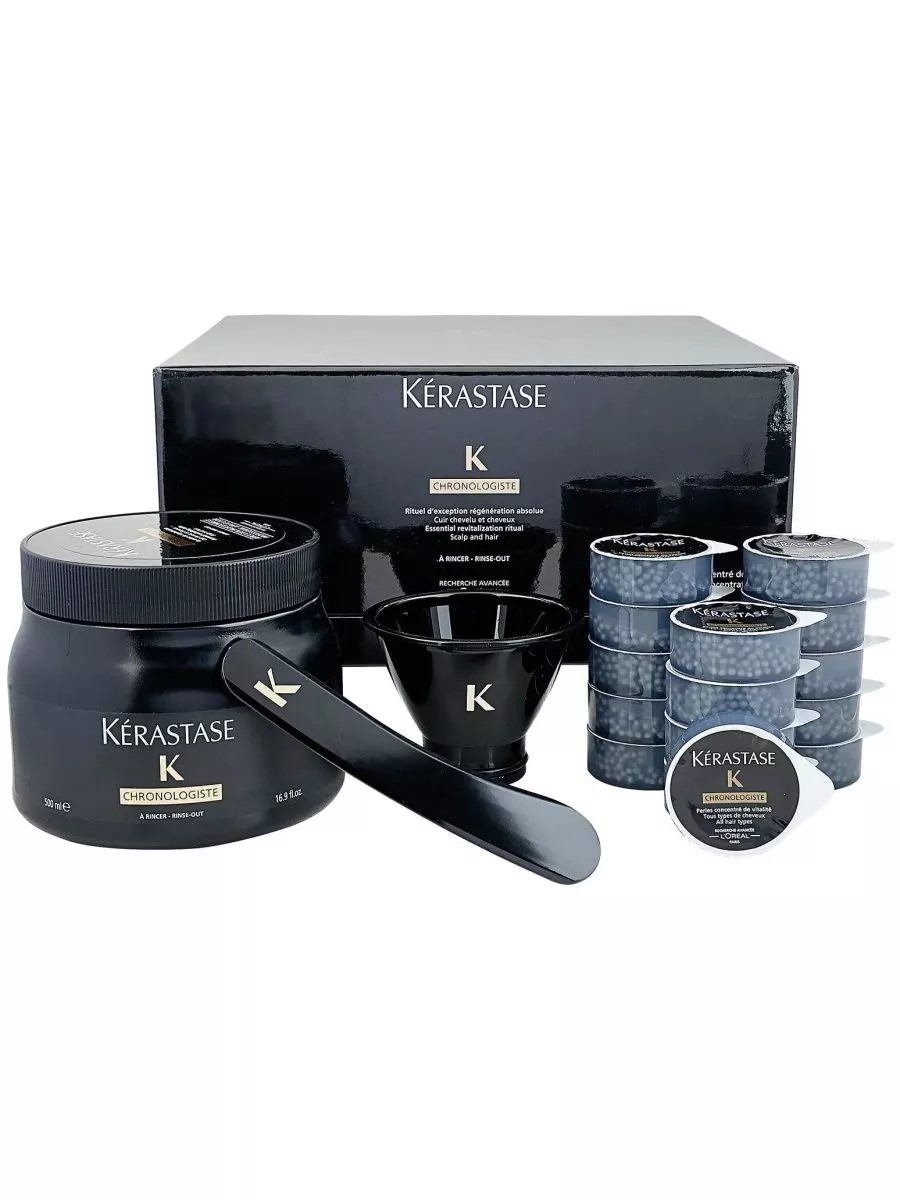 Kerastase Chronologiste - Revitalizing Concentrated Mask Set. The luxurious texture of the nourishing Chronologiste Regenerant cream mask, containing the Abyssin molecule, combines with the micro-granules of the Chronologiste Concentrate for a unique hair revitalization ritual. The set includes two products: the Chronologiste Regenerant Revitalizing Cream Mask, 250 ml + 8 Vital Concentrate Pearls (8 ml each). Contains Hyaluronic Acid, the Abyssin molecule, and Vitamin E, which combat the main signs of aging. Provides intense hydration, maintains smoothness, protects hair from humidity, and makes hair 6 times shinier and stronger. The product has the recognizable subtle Chronologiste scent with notes of tea rose, light wood, and musk. Hair is nourished and hydrated for softness and shine. 87% more hydrated hair and scalp. Hair is 6 times shinier. Hair is stronger. 250 ml + 8 x 8 ml