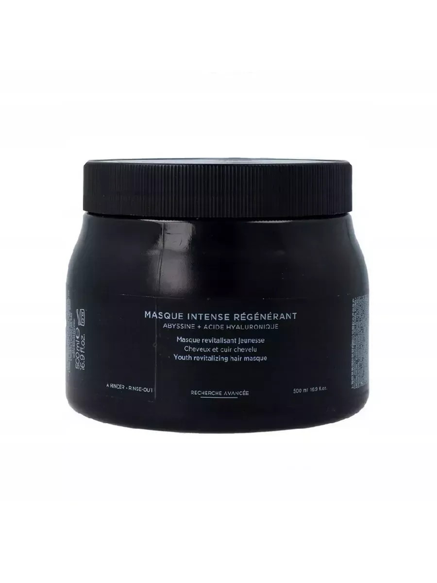 The Chronologiste Regenerant revitalizing mask for intensive hair nourishment contains hyaluronic acid, the Abyssine molecule, and vitamin E, which combat the main signs of hair aging.