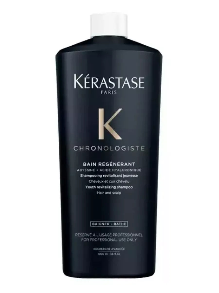 Kerastase Chronologiste Regenerant is a revitalizing and toning shampoo-bath that combats the main signs of aging of the scalp and hair: dry, sensitive, weakened scalp and dull, brittle and thinning hair. Contains hyaluronic acid, the Abyssin molecule and Vitamin E, which combat the main signs of aging. Provides long-lasting hydration to the scalp, strengthens hair, saturates it with moisture, restores elasticity and adds luxurious shine. The product has a recognizable subtle Chronologiste aroma with notes of tea rose, light wood and musk. Provides a feeling of comfort. Hair and scalp are 44% more hydrated 48 hours after use. Intensively cleanses hair and removes impurities. Makes hair stronger. Restores hair's natural shine. 1000 ml