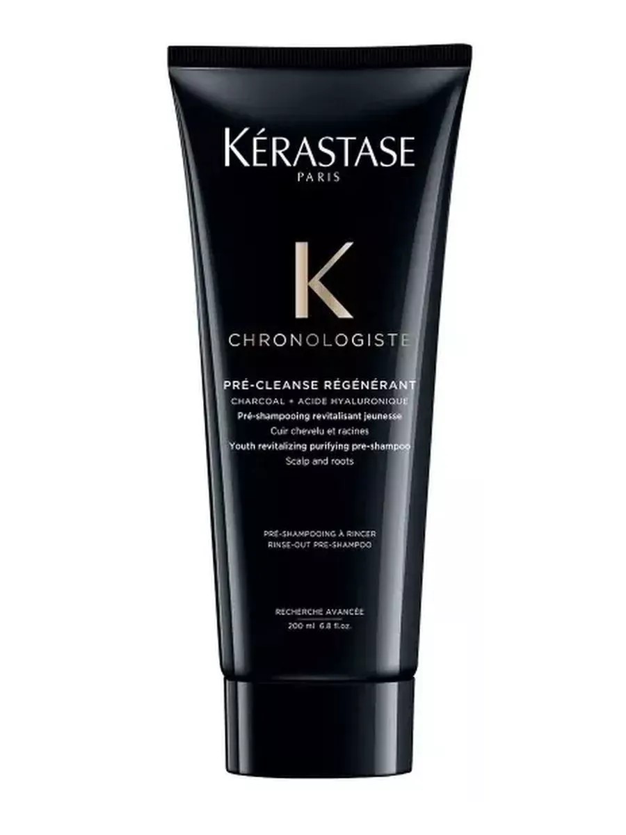 Kerastase Chronologiste Regenerant Pre-Cleanse is a revitalizing pre-shampoo. A revitalizing treatment for intensive cleansing of the scalp and hair roots. Use before the Shampoo-Bath. Removes 96% more impurities than regular shampoo. Hyaluronic acid moisturizes hair and scalp. The luxurious, thick, black gel texture provides a unique experience. The product has the recognizable, subtle Chronologiste scent with notes of tea rose, light wood, and musk. Intensively cleanses hair and scalp. Removes 96% more impurities than regular shampoo. Enhances the effectiveness of subsequent care products. Fills the scalp with energy and a feeling of freshness. 200 ml